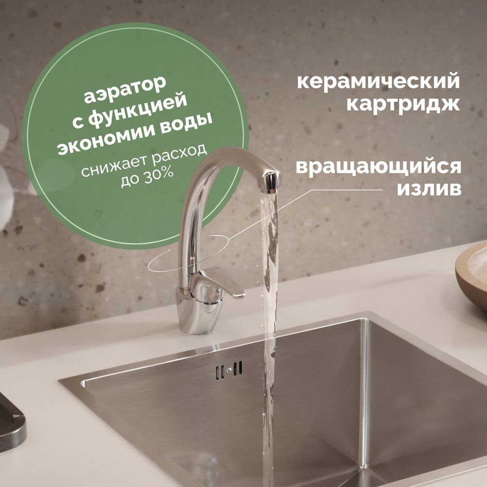 Перед установкой убедитесь, что ваш кухонный гарнитур совместим с размером и конструкцией данного смесителя. Он оснащён аэратором, который помогает экономить воду, однако для максимальной эффективности периодически рекомендуется очищать его от известковых отложений. Смеситель поставляется с 5-летней гарантией - это свидетельство его высокого качества и надёжности. Изготовлено в России.
