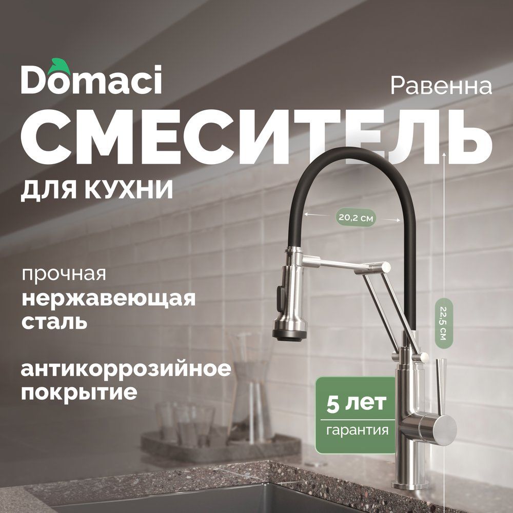 Смеситель для кухни Domaci Равенна DCB 7012 с гибким изливом предлагает современное сочетание функциональности и стильного дизайна. Изготовленный из нержавеющей стали с глянцевой сатиновой отделкой, он легко впишется в интерьер любой кухни и обеспечит комфорт в повседневной эксплуатации. Гибкий излив — это идеальное решение для тех, кто ценит удобство и универсальность. Он подходит для комфортного наполнения кастрюль и мытья крупногабаритных предметов.