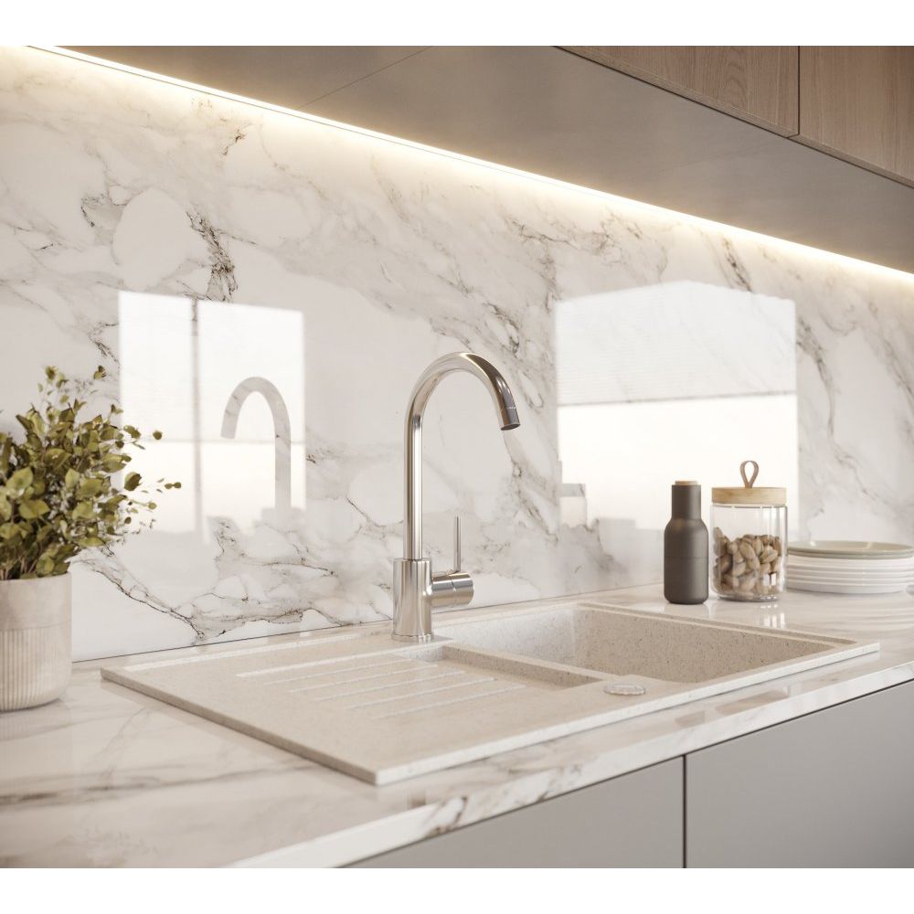 Смеситель для кухни Domaci Равенна изготовлен из пластика и имеет глянцевую хромированную поверхность, которая придает изделию стильный вид. Высота излива составляет 26,5 см, а длина — 19 см, что делает его удобным в эксплуатации. Оснащен керамическим картриджем и гибкой подводкой для легкой установки. Аэратор помогает экономить воду, а надежные крепления гарантируют стабильное расположение. Производится в России и поддерживается 15-летней гарантией.