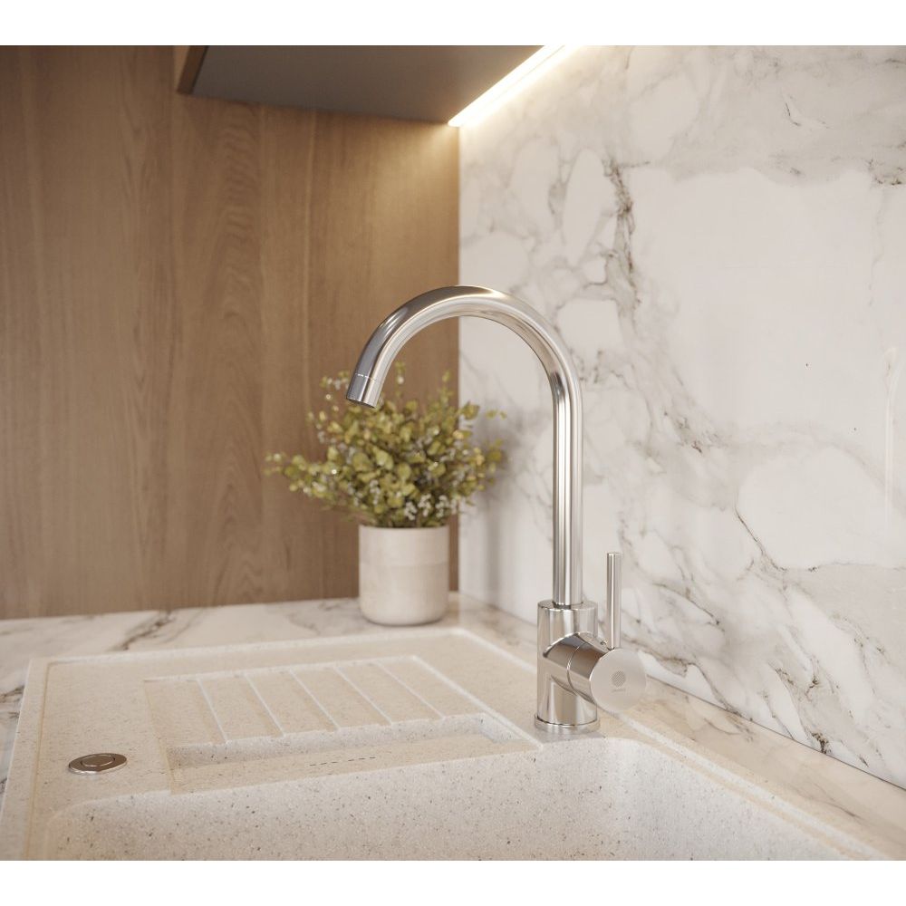 Особенности установки этого смесителя заключаются в стандартной гибкой подводке, что делает его совместимым с большинством кухонных раковин. Убедитесь в достаточном пространстве для установки излива высотой 26,5 см и длиной 19 см перед покупкой. Благодаря своей устойчивости к коррозии и низким температурам, этот смеситель идеально подходит как для городской квартиры, так и для загородного дома.