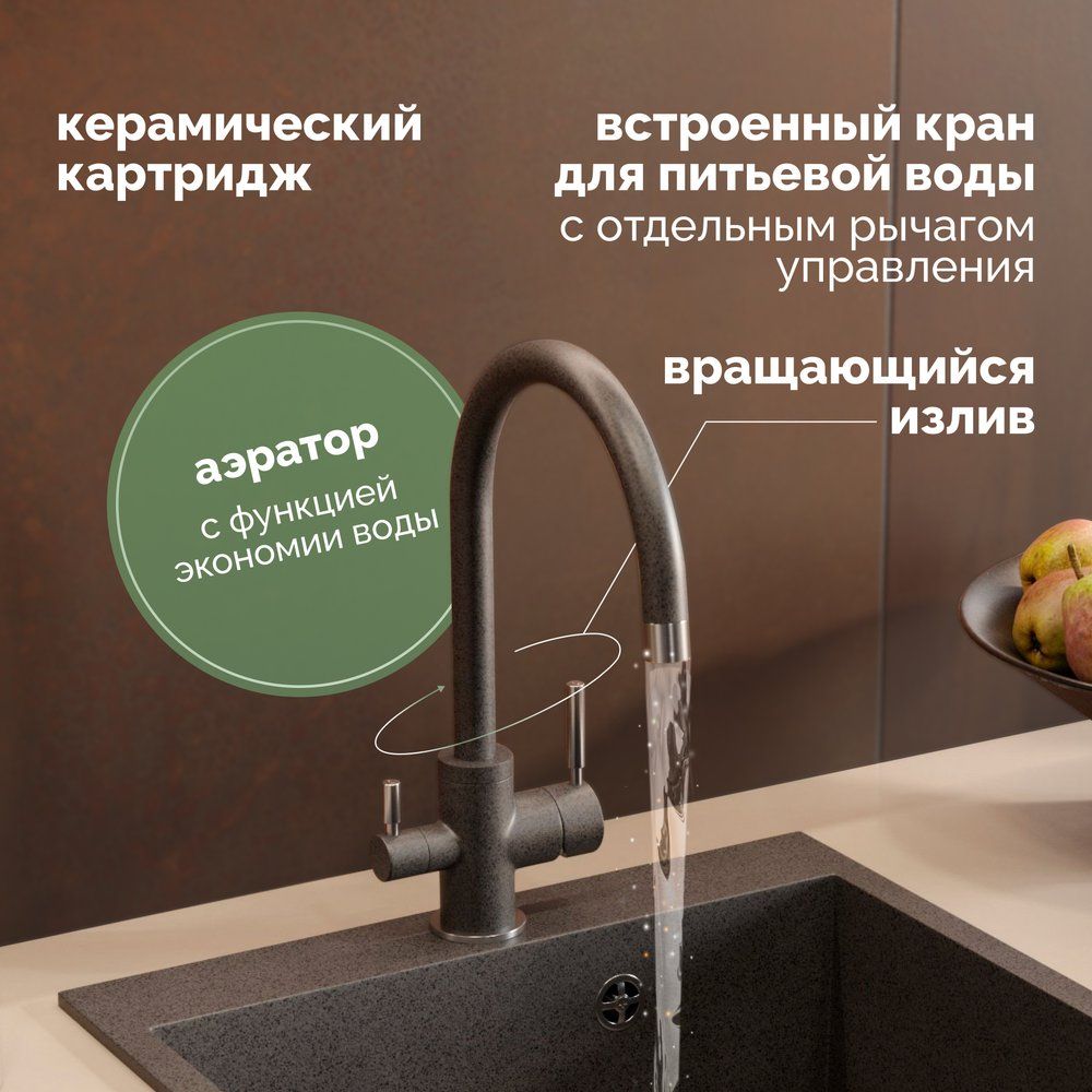 - Удобный совмещенный излив для фильтрованной воды.