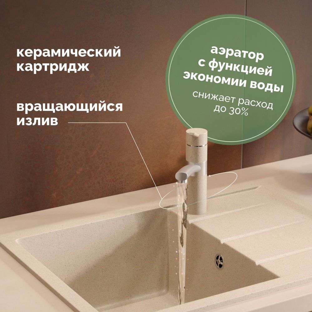 - Аэратор и гибкая подводка входят в комплект, упрощая монтаж и обеспечивая экономию воды.