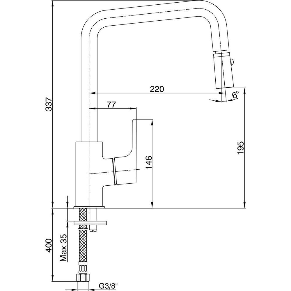 Смеситель оснащён гибкой подводкой, что облегчает процесс установки и обеспечивает надежное подключение. Высота излива составляет 19.5 см, а длина — 22 см, что обеспечивает удобство в использовании, позволяя легко наполнять крупные кастрюли и емкости. Керамический картридж гарантирует плавный ход рукоятки и долговечность механизма регулировки воды.