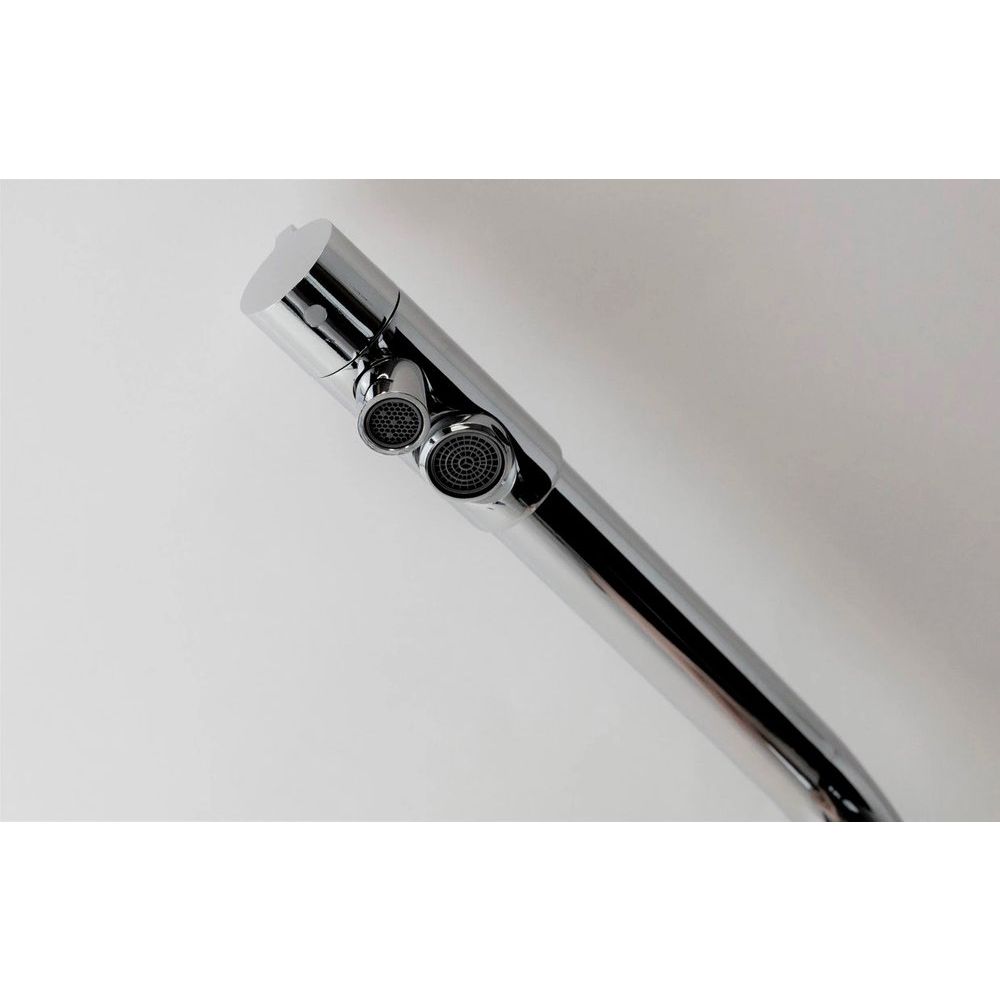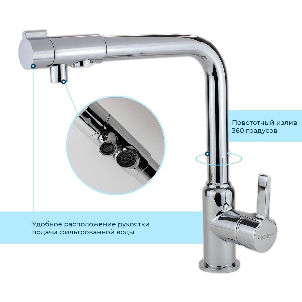 Смеситель ESKO K23 изготовлен из прочной латуни и имеет стильное хромированное покрытие. Совмещенный излив позволяет использовать фильтрованную воду без дополнительных приспособлений, что значительно облегчает процесс готовки и ухода за кухонной посудой. Высота излива составляет 26.8 см, а его длина — 22.8 см, что обеспечивает удобство при использовании крупных кастрюль и высоких емкостей. Аэратор и гибкая подводка входят в комплектацию, обеспечивая простой и надежный монтаж.