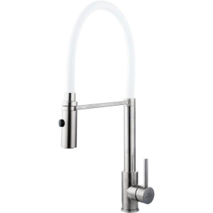 Смеситель выполнен из нержавеющей стали и силикона, что гарантирует долговечность и устойчивость к коррозии. Гибкий излив высотой 20 см и длиной 22 см позволяет легкость в использовании, а керамический картридж обеспечивает плавность работы. Матовая поверхность добавляет эстетической ценности, а встроенный аэратор и гибкая подводка упрощают эксплуатацию.