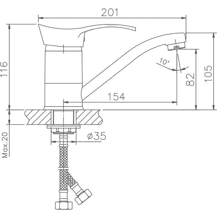 Смеситель обладает компактными размерами, что идеально подходит для любых кухонных интерьеров. Высота излива составляет 8.2 см, а длина — 15.4 см, что обеспечивает удобство в использовании без лишних брызг. Глянцевая поверхность придаёт изделию изысканный вид. Предусмотрена гибкая подводка и система быстрого монтажа, позволяющая устройству легко и быстро устанавливаться.