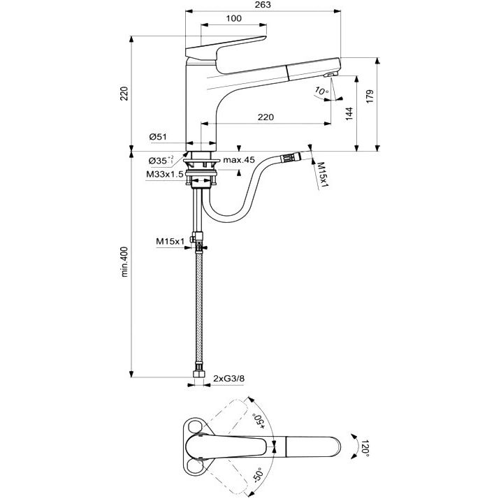 Смеситель с фиксированным изливом имеет высоту 14.4 см и длину 22 см, что делает его идеальным для большинства кухонных моек. Глянцевая поверхность придает изделию современный вид и облегчает уход. Он оснащён аэратором и гибкой подводкой, что помогает экономить воду и облегчает использование. Встроенные функции, как экономия воды и ограничитель температуры, обеспечивают безопасность и экологичность. Быстрая установка достигается благодаря системе быстрого монтажа, а пятилетняя гарантия подтверждает качество изделия.