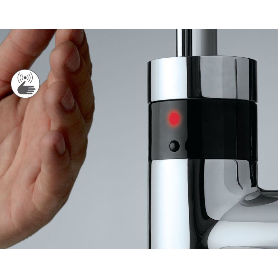 Электронный смеситель Kludi E-GO 422100575 — это не просто кухонный помощник; это истинное воплощение передовых технологий, способных улучшить каждодневные задачи на кухне. Ориентированный на пользователя, он совмещает в себе изысканный стиль и высокотехнологичные функции. Интегрированный оптический датчик обеспечивает лёгкость и комфорт в управлении водоснабжением, а возможность традиционного рычажного управления сохраняет привычный способ взаимодействия. Встроенный керамический картридж укреплён магнитным клапаном и имеет ограничитель температуры горячей воды, что исключает возможность ожогов — это особенно важно для безопасности использования на кухне. Обогащая поток воздуха за счёт аэратора Cashe, струя воды становится мягче, а её расход значительно сокращается, что благоприятно сказывается на экономии ресурсов.