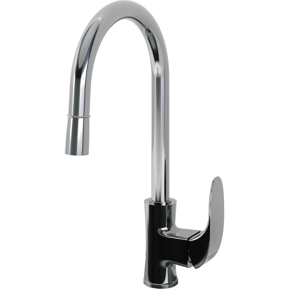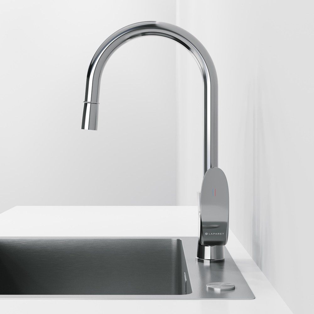 Смеситель изготовлен из качественной латуни и покрыт глянцевым хромовым покрытием, придающим ему привлекательный блеск. Высота излива составляет 21.6 см, а длина 20.7 см, что обеспечивает удобное использование даже для больших кастрюль. Керамический картридж гарантирует плавность и долговечность работы. В комплект входят аэратор и гибкая подводка, а также крепления для легкой установки. Дополнительно оснащен ручным выдвижным душем для максимального удобства.