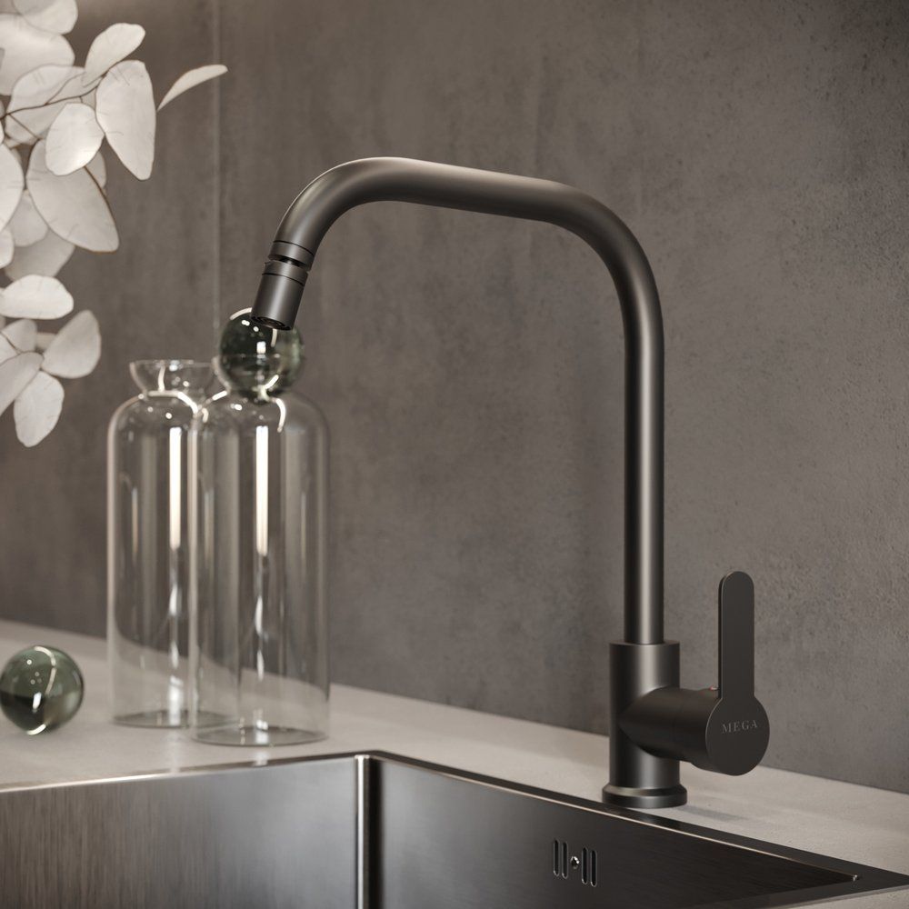 Смеситель для кухни MEGA City MG- ZRV104-B в глубоком черном цвете впечатляет своим современным дизайном и функциональностью. Его матовое порошковое покрытие не только придает эстетичный вид, но и обеспечивает защиту от царапин и химических воздействий. Изготовленный из латунного сплава по технологии Eco-friendly alloy, смеситель не содержит свинца, что делает его абсолютно безопасным для здоровья. Удобный однорычажный механизм с поворотным изливом и вращающимся на 360 градусов аэратором позволит вам гибко управлять струёй воды. Технология WaterECO способствует экономичному использованию воды, а монтаж по системе Quick installation осуществляется легко и быстро.