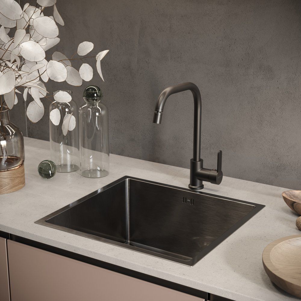 Смеситель выполнен из прочной и безопасной латуни. Высота излива составляет 26 см, а длина - 21 см, обеспечивая удобство использования на кухне. Встроенный керамический картридж гарантирует долгий срок службы и бесперебойную работу. Приятное на ощупь матовое покрытие не только эстетично выглядит, но и защищает от внешних воздействий. В комплекте предусмотрен аэратор, гибкая подводка и надежные крепления. На изделие предоставляется 5-летняя гарантия, что подчеркивает его высокое качество и надежность.