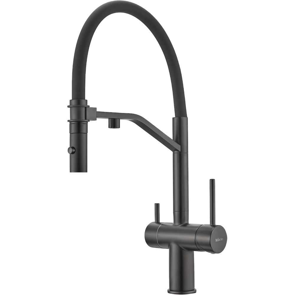 Смеситель для кухни Milacio Ultra MCU.557.TB в актуальном total black исполнении с гибким изливом — это не только воплощение современного стиля, но и практичность в каждодневном использовании. Благодаря своему многофункциональному дизайну, этот смеситель позволит удобно управлять потоками воды и обеспечит подачу как обычной, так и фильтрованной воды через отдельный излив. Изящная матовая поверхность станет элегантным акцентом, дополняющим интерьер вашей кухни.