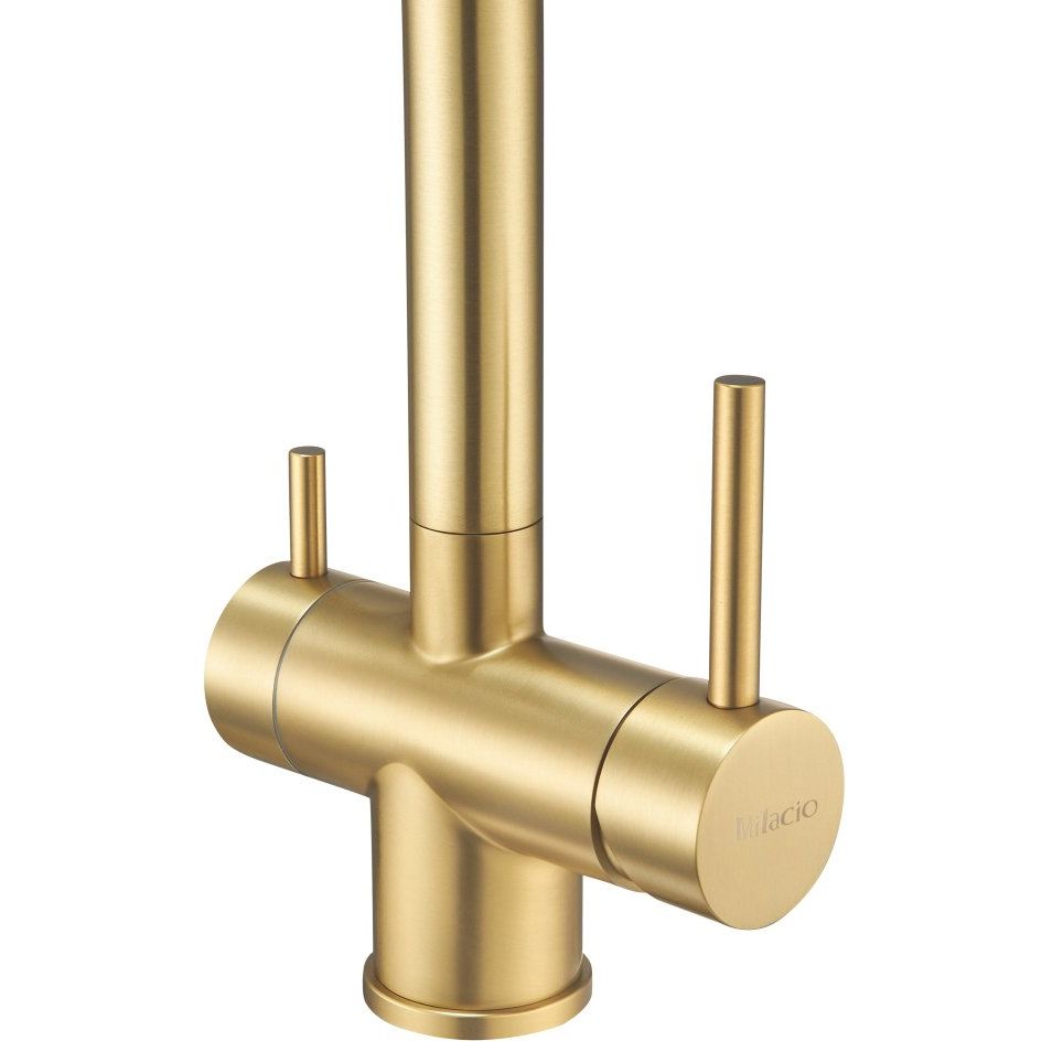 Смеситель для кухни Milacio Ultra MCU.558.GD — это пример сочетания изысканного дизайна и передовых технологий. Выполненный из нержавеющей стали с долговечным PVD покрытием, этот смеситель станет ярким акцентом на вашей кухне. Благодаря продуманной конструкции, он легко монтируется как на раковину, так и на столешницу, что позволяет вам выбрать наиболее удобный вариант установки. Эргономичная ручка управления обеспечивает плавную подачу горячей и холодной воды, открывается на 10 градусов к стене и на 90 градусов от стены, что позволяет размещать смеситель вблизи стены без сложностей. Это изделие полностью соответствует европейским стандартам и сертифицировано по ГОСТ Р.