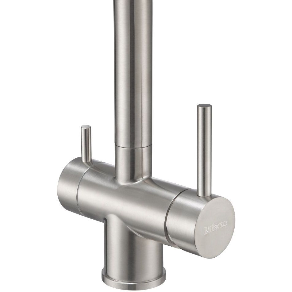 Смеситель Milacio Ultra MCU.558.SS имеет размерами высоту излива 27 см и длину 24.5 см, что обеспечивает удобство при мытье посуды. Оснащен надежным керамическим картриджем. Подключение осуществляется через гибкую подводку, а встроенный аэратор обеспечивает плавный поток воды. Дополнительная подача питьевой воды реализована через отдельный излив, что делает его отлично подходящим для использования с фильтрами. Продукция поставляется с гарантией на 3 года, страна производитель — Испания.