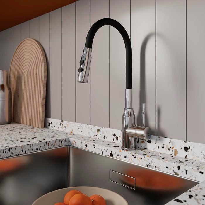 Смеситель для кухни Milardo Meal M01SB2FM05 — это новое слово в удобстве и функциональности. Его гибкий излив позволяет менять направление потока, что расширяет рабочую область. При подаче горячей воды вы можете безопасно изменять форму излива благодаря термостойкой силиконовой оболочке. Усиленная стальная конструкция придает изливу устойчивость даже при высоком давлении воды, а возможность переключения между двумя режимами — «душ» и стандартный — делает процесс мытья посуды и приготовления пищи еще удобнее. Сами кнопки переключения расположены на наружной стороне излива, что упрощает их использование.