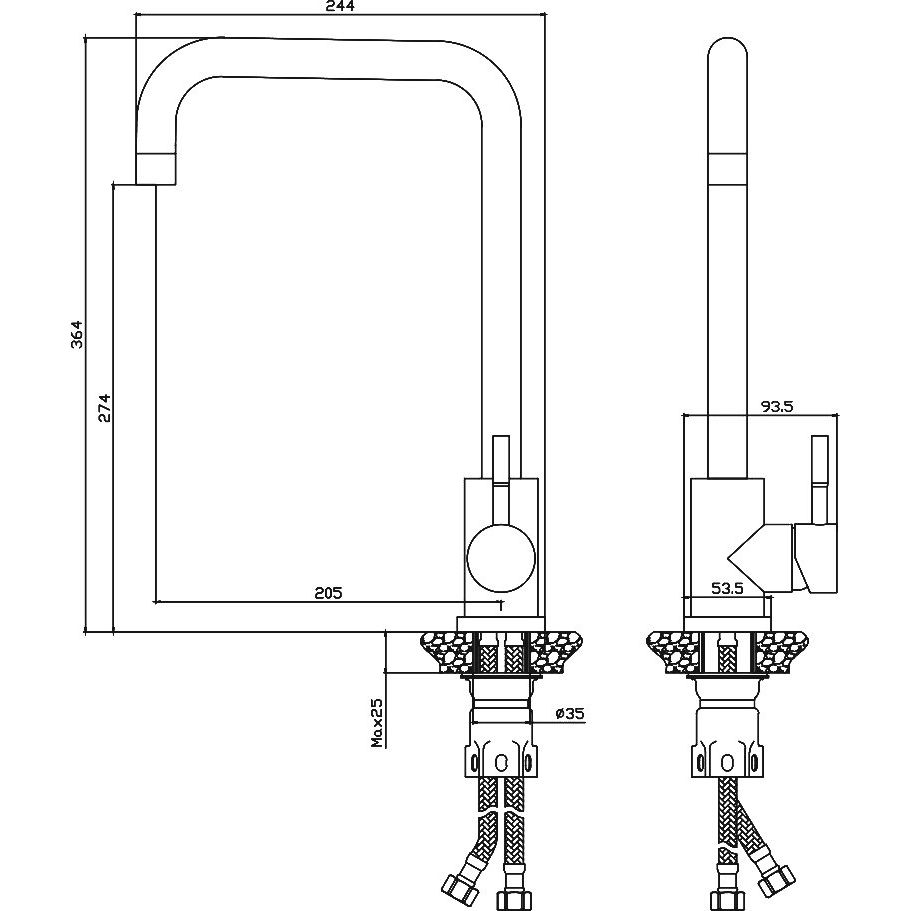 Этот смеситель имеет высоту излива 27,4 см и длину излива 20,5 см, что обеспечивает удобное использование даже с высокими кастрюлями. Керамический картридж обеспечивает плавное регулирование воды, а гибкая подводка длиной 60 см делает монтаж легче. Смеситель обладает функцией экономии воды с аэратором для мягкой и насыщенной струи. Изделие поставляется с гарантийным сроком в 7 лет, подтверждающим его качество и надежность. Производство — Испания.