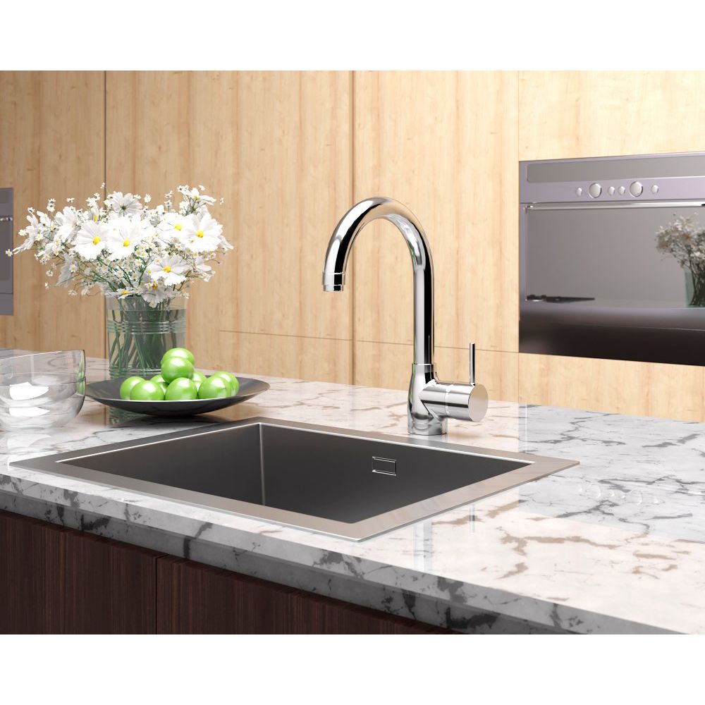 Смеситель оборудован керамическим картриджем, который обеспечивает плавное и точное регулирование температуры и напора воды. Аэратор способствует экономичному расходу воды и значительно снижает уровень шума. Высота и длина излива составляют по 20 см, что делает смеситель удобным для всех типов кухонных раковин. Гибкая подводка и прочные крепления упрощают процесс установки.