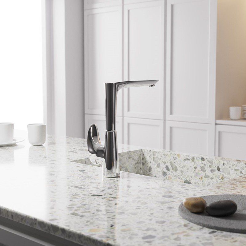 Итальянские дизайнеры из бренда Paini представляют смеситель для кухни Verona VRCR572KM, который не только украсит любую кухню своим элегантным обтекаемым дизайном, но и обеспечит надежное функционирование на долгие годы. Этот смеситель идеально вписывается в современный интерьер благодаря своему глянцевому 2-слойному никель-хромовому покрытию. Изготовленный из высококачественной латуни, смеситель не только экологичен, но и устойчив к потускнению и царапинам. В конструкции используется керамический картридж Nuovo Galatron, что гарантирует отсутствие протечек и шума. Высокий корпус и поворотный излив — это практичное решение для легкого мытья габаритной посуды и наполнения глубоких емкостей. Уникальный аэратор Neoperl эффективно подает воду под наклоном, предотвращая разбрызгивание.