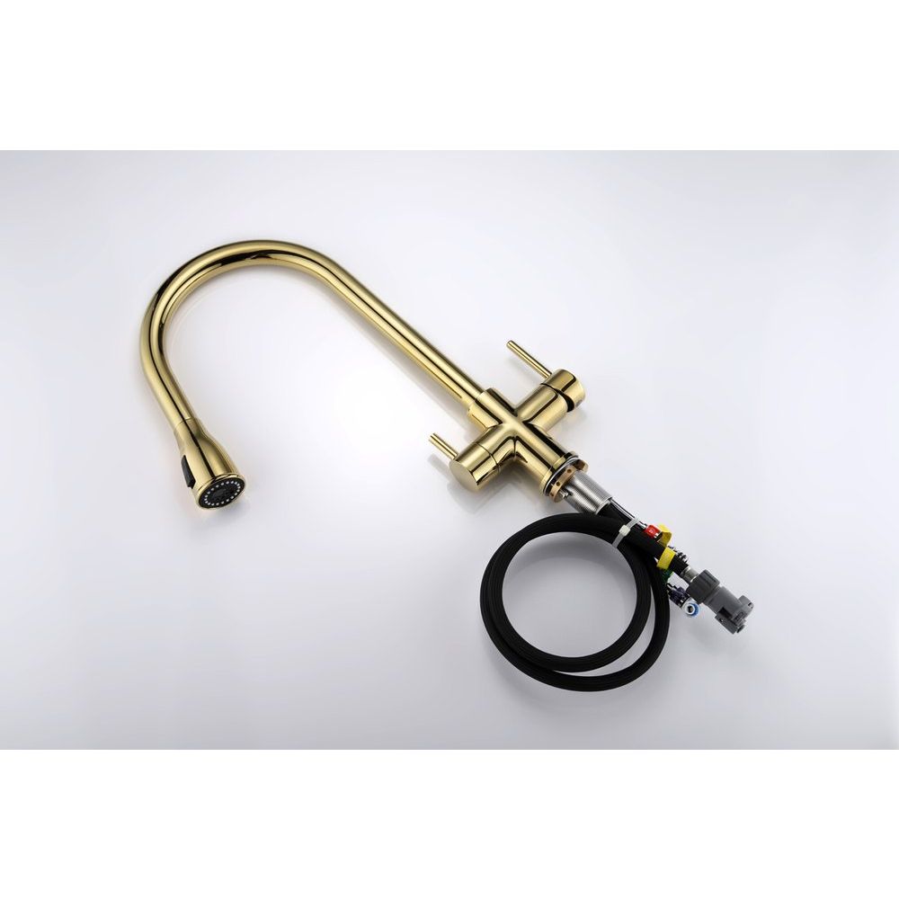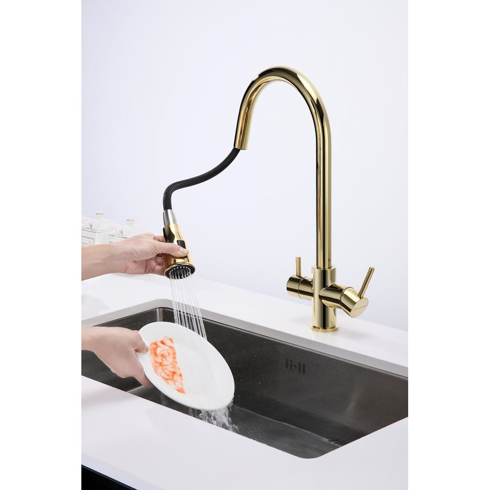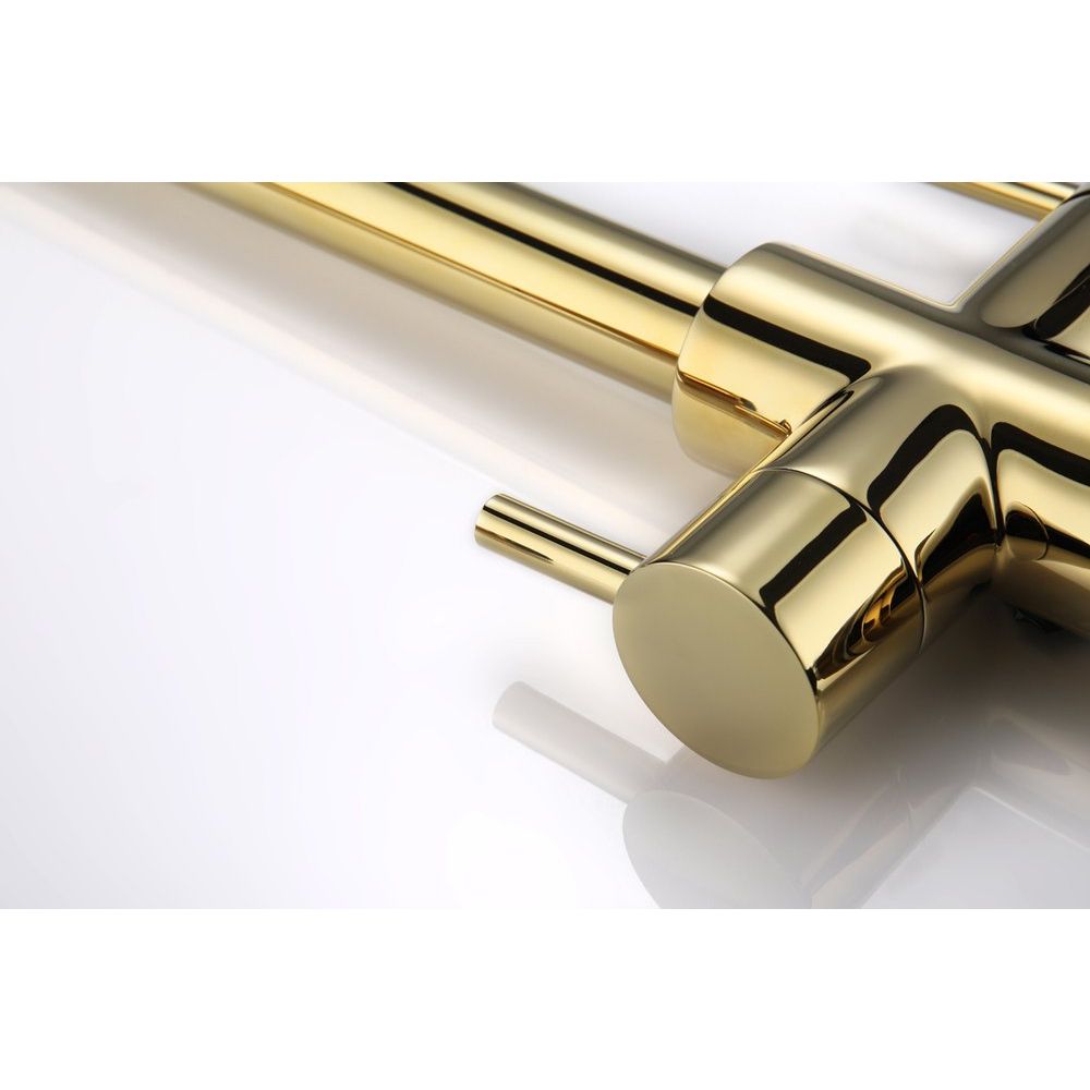 Ваш кухонный интерьер требует стильного акцента, который сочетается с функциональностью и надежностью? Смеситель для кухни Paulmark Lange 214212-G в цвете золота — это идеальное решение для вас. Изготовленный из прочной латуни, этот смеситель предлагает не только элегантный внешний вид, но и превосходную долговечность. Выдвижной излив позволяет легко маневрировать потоком воды для различных кухонных задач, а совмещенный излив для фильтрованной воды гарантирует удобство и чистоту. Дополнительный режим «душ» делает ополаскивание фруктов и овощей быстрым и эффективным.