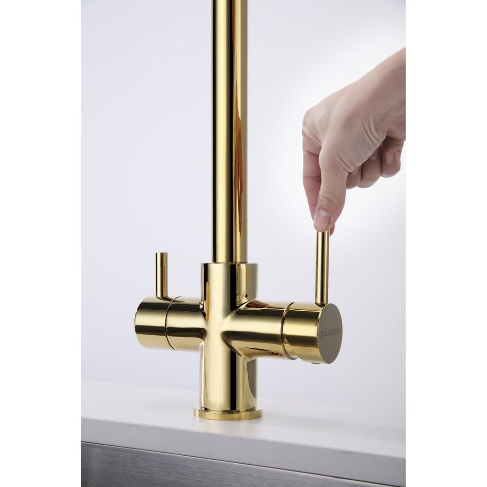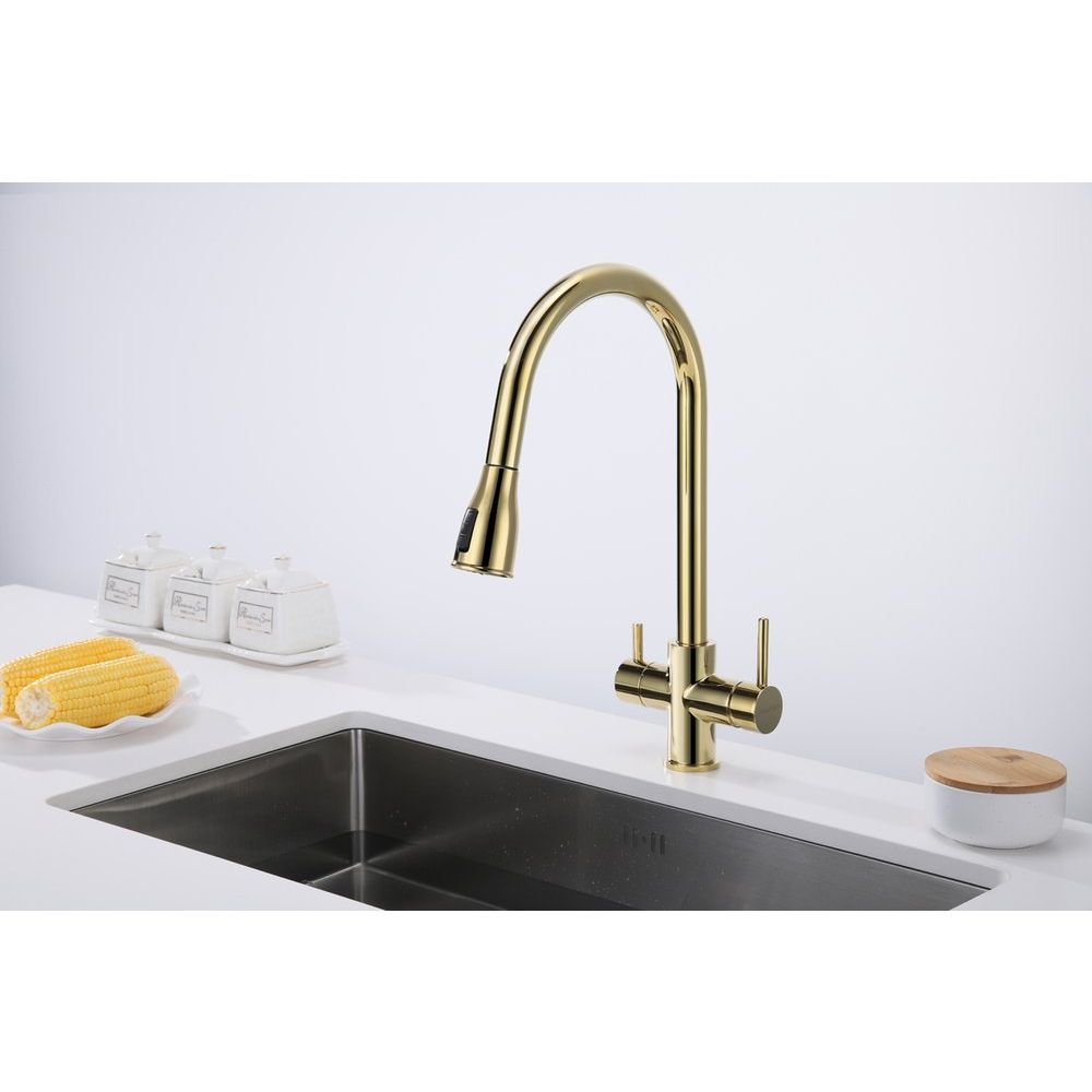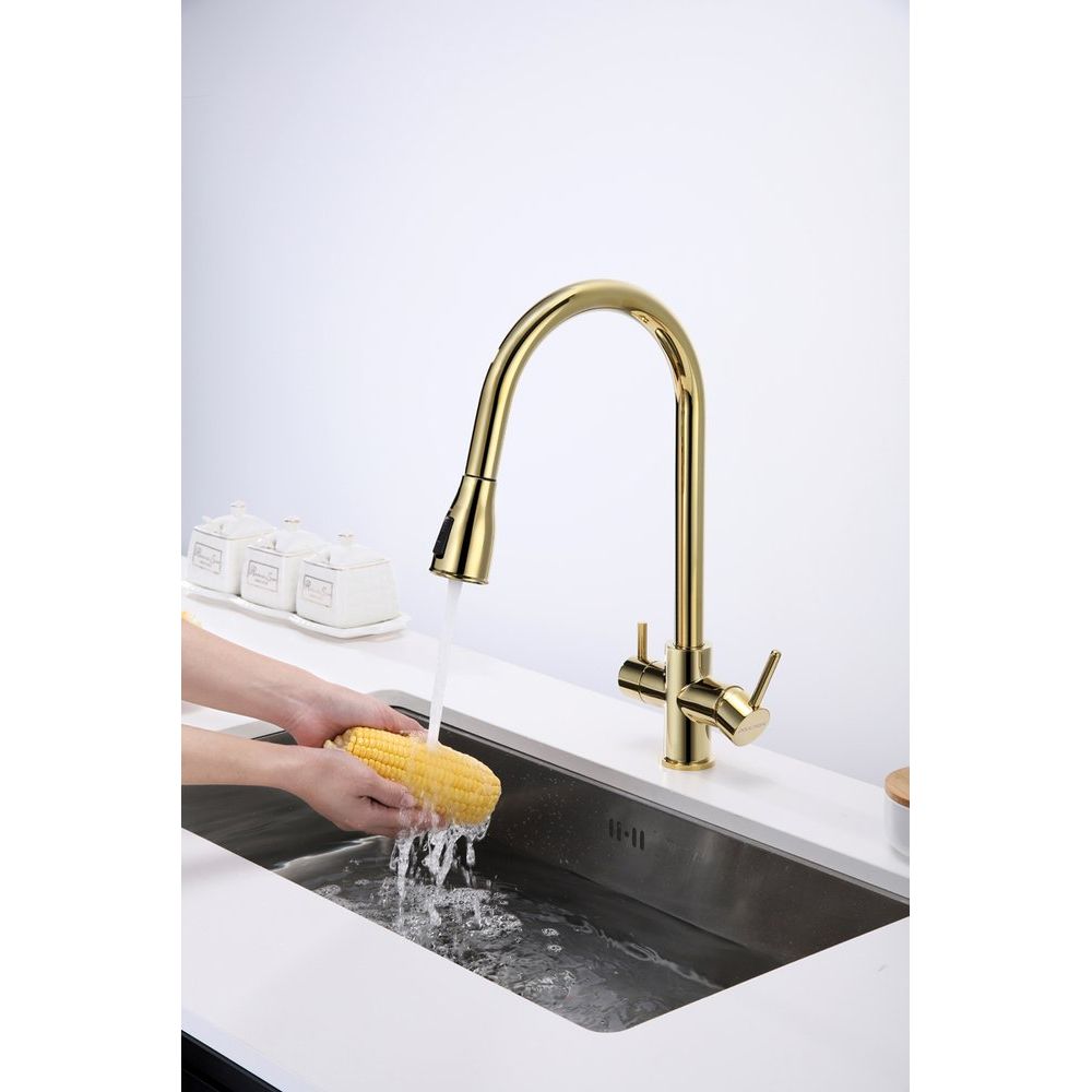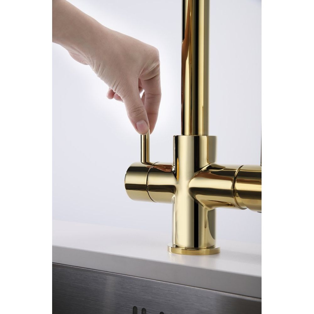 Ваш кухонный интерьер требует стильного акцента, который сочетается с функциональностью и надежностью? Смеситель для кухни Paulmark Lange 214212-G в цвете золота — это идеальное решение для вас. Изготовленный из прочной латуни, этот смеситель предлагает не только элегантный внешний вид, но и превосходную долговечность. Выдвижной излив позволяет легко маневрировать потоком воды для различных кухонных задач, а совмещенный излив для фильтрованной воды гарантирует удобство и чистоту. Дополнительный режим «душ» делает ополаскивание фруктов и овощей быстрым и эффективным.