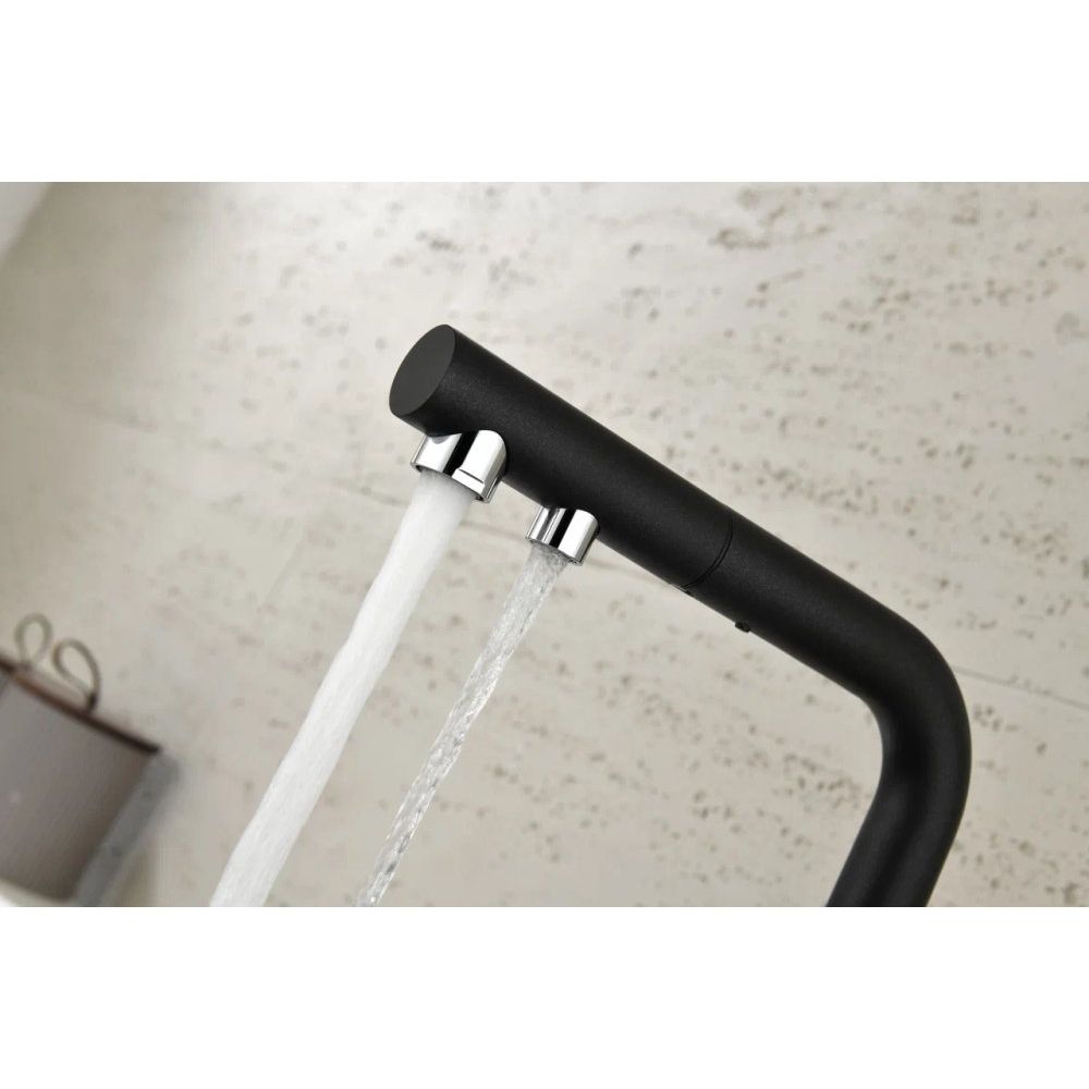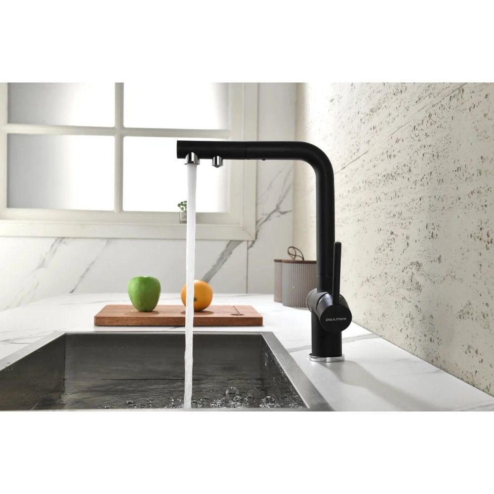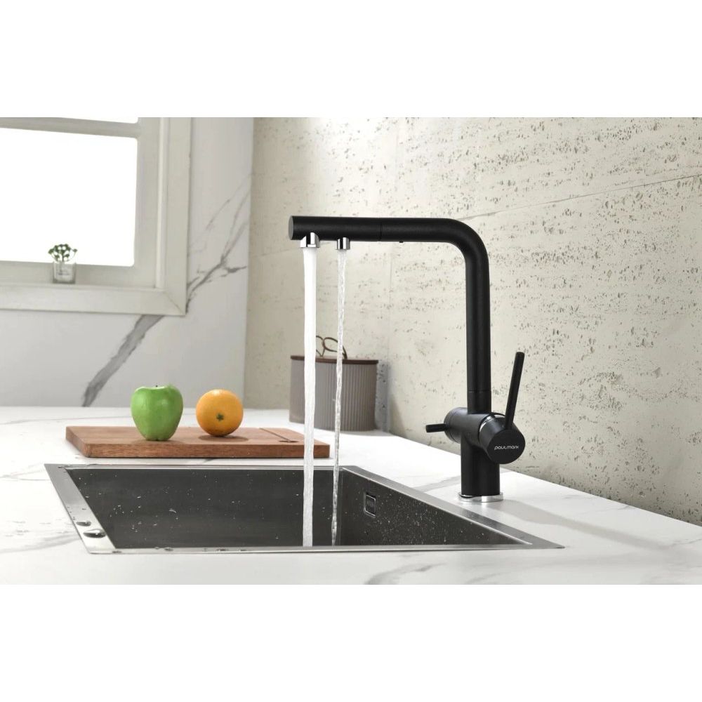 Смеситель для кухни Paulmark Serpentine Se213222-418 — это идеальное решение для тех, кто стремится объединить стиль и функциональность. Окрашенный в элегантный черный цвет, этот смеситель внесет современные нотки в интерьер вашей кухни. Латунная конструкция гарантирует долговечность, а выдвижной излив значительно увеличивает удобство использования, позволяя без труда промыть любую посуду. Особое внимание уделено подаче питьевой воды — она осуществляется через дополнительный излив, что обеспечивает максимальный комфорт и безопасность.