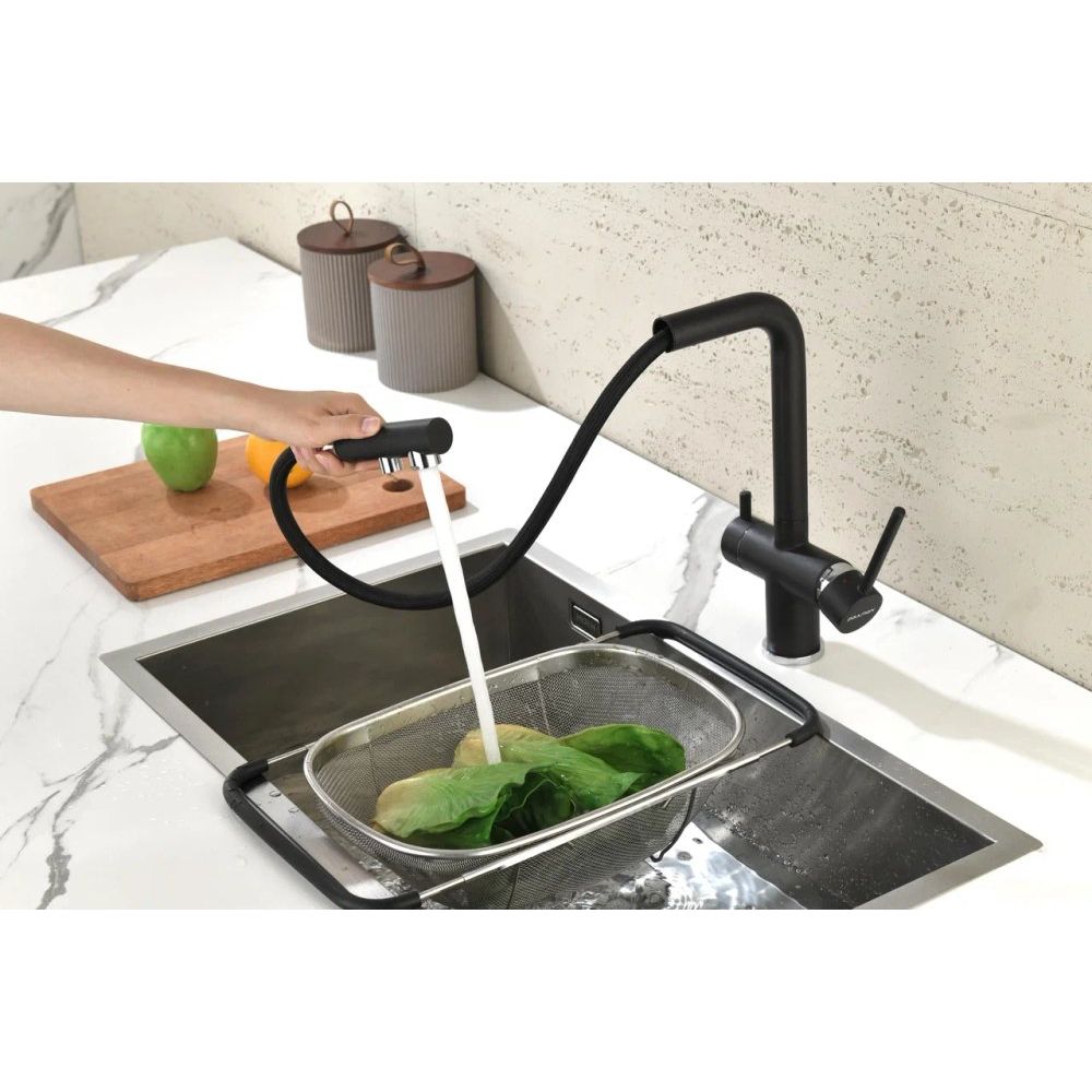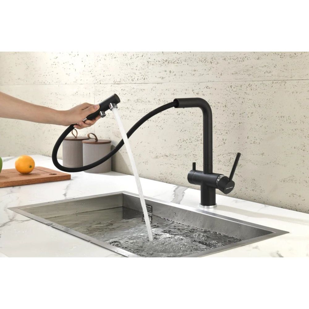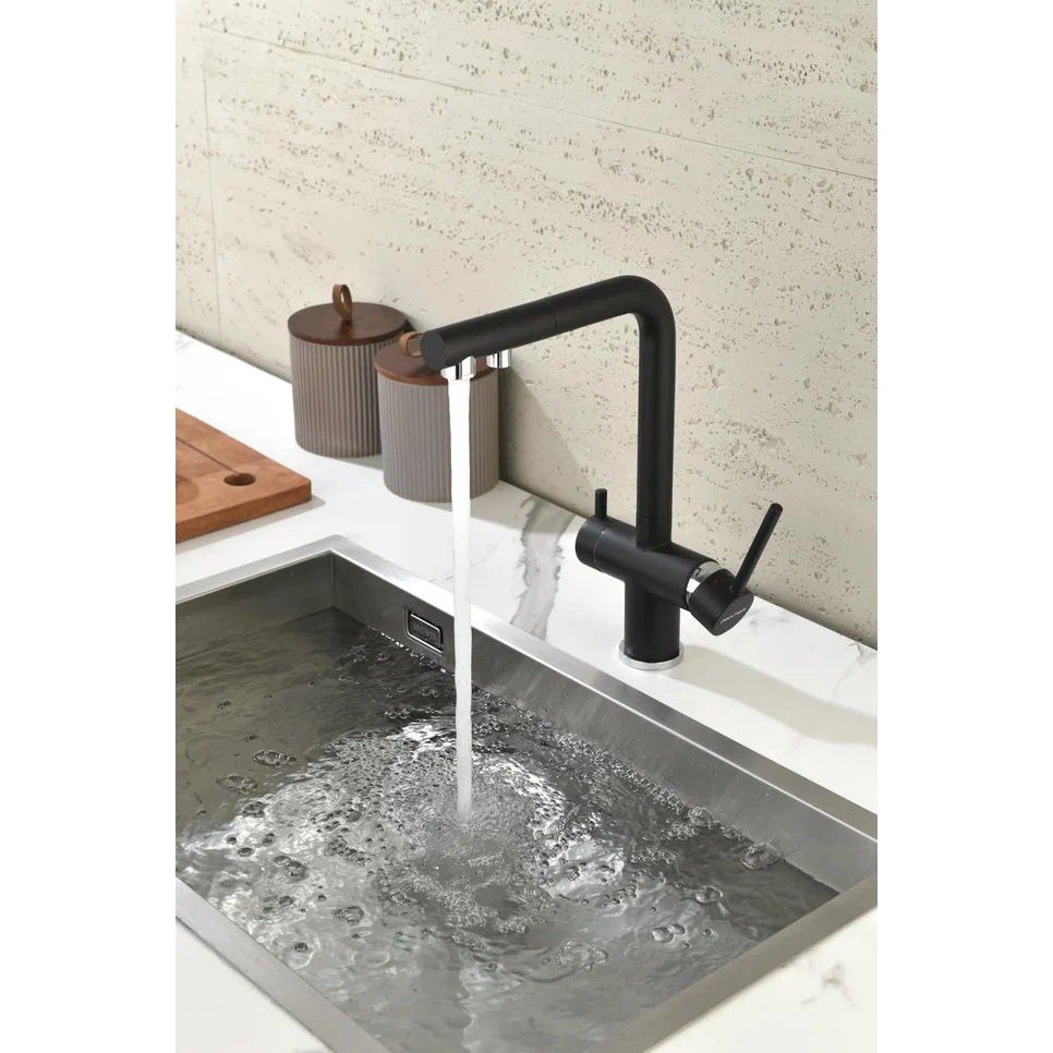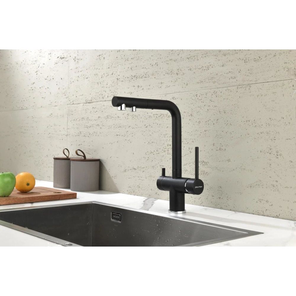 Смеситель для кухни Paulmark Serpentine Se213222-418 — это идеальное решение для тех, кто стремится объединить стиль и функциональность. Окрашенный в элегантный черный цвет, этот смеситель внесет современные нотки в интерьер вашей кухни. Латунная конструкция гарантирует долговечность, а выдвижной излив значительно увеличивает удобство использования, позволяя без труда промыть любую посуду. Особое внимание уделено подаче питьевой воды — она осуществляется через дополнительный излив, что обеспечивает максимальный комфорт и безопасность.
