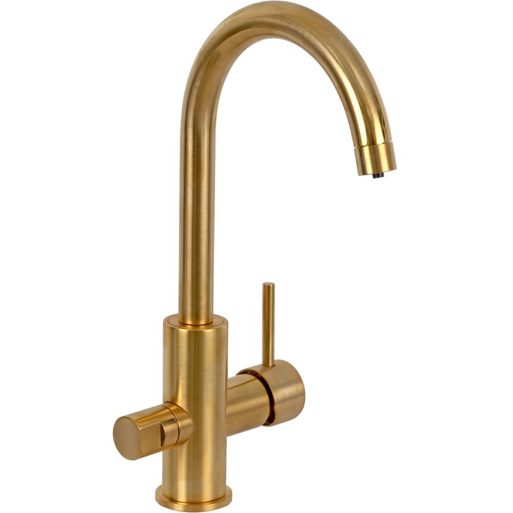 Откройте для себя сочетание итальянского качества и утонченного дизайна с кухонным смесителем Remer Minimal N792DW в изысканном золоте брашированное. Эта модель не только станет стильным акцентом вашей кухни, но и обеспечит удобную подачу как обычной, так и отфильтрованной воды, благодаря совмещенному изливу. Смеситель из коллекции Minimal идеально вписывается в современный интерьер и отличается превосходной функциональностью.