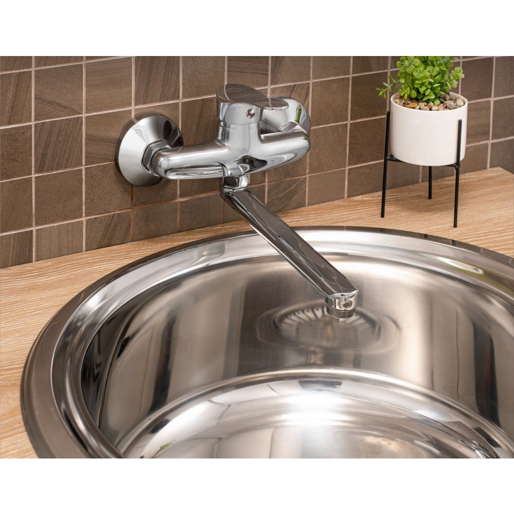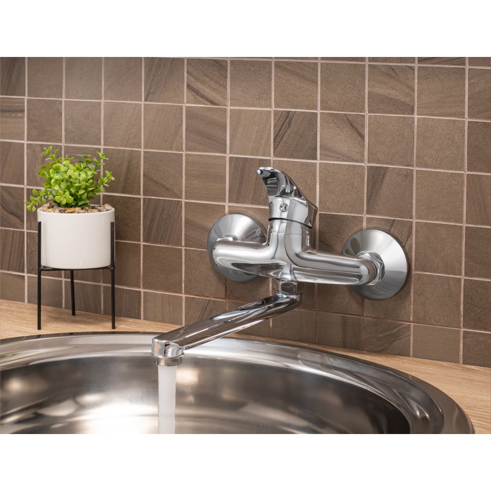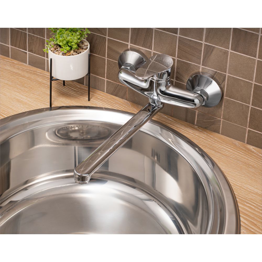 Смеситель оснащен аэратором и эксцентриками для облегчения установки. Длина излива составляет 22 см, что обеспечивает комфортное использование в любой кухне. Благодаря функции экономии расхода воды, смеситель позволяет потреблять всего 22 литра в минуту, что снижает расходы на коммунальные услуги. Надежный керамический картридж гарантирует плавное управление напором и температурой воды.