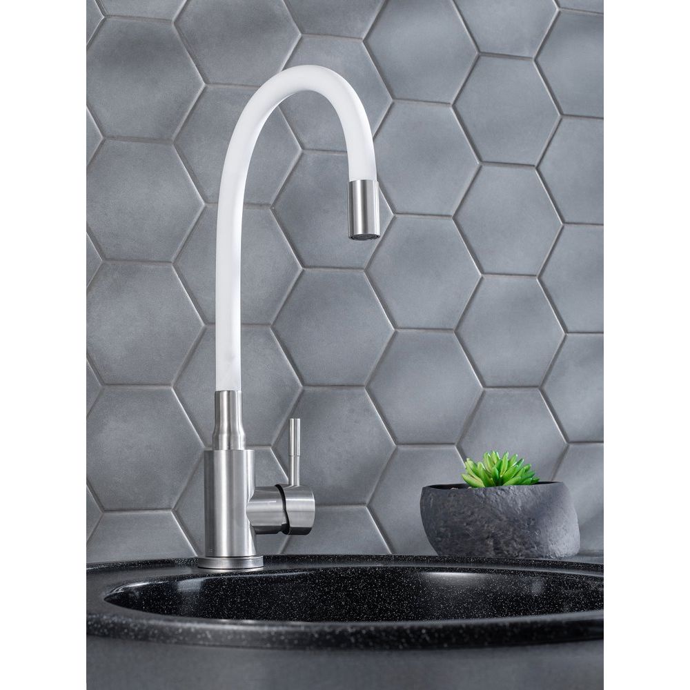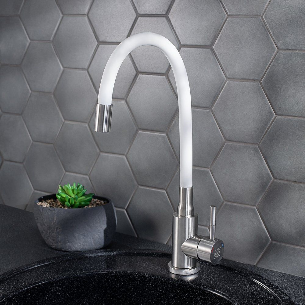 Смеситель для кухни РМС Sus124w SUS124W-016F в белом цвете сочетает в себе элегантность и функциональность, идеально вписываясь в любой современный интерьер. Изготовленный из высококачественной нержавеющей стали с матовой поверхностью, он обеспечивает долговечность и устойчивость к коррозии даже в самых экстремальных условиях использования. Применение гибкого излива и керамического картриджа добавляет универсальности и удобства, создавая плавное управление потоком воды и длительное использование устройства.