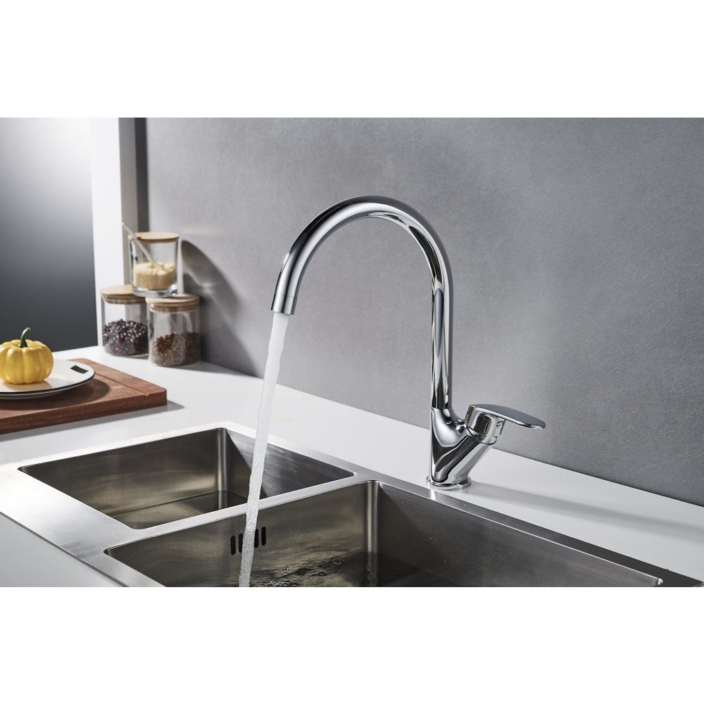 Смеситель обладает высотой излива в 21,7 см и длиной 20,7 см, что делает его удобным для использования в различных кухонных интерьерах. Оснащён качественным керамическим картриджем, который гарантирует надежную работу и мягкое управление температурой и напором воды. Глянцевая хромированная поверхность защищает от коррозии и сохраняет блеск на протяжении всей эксплуатации. Комплектация включает в себя пластиковый аэратор, гибкую подводку и крепления для легкой установки.