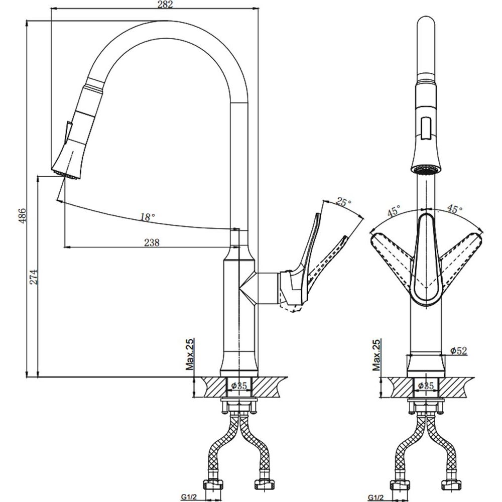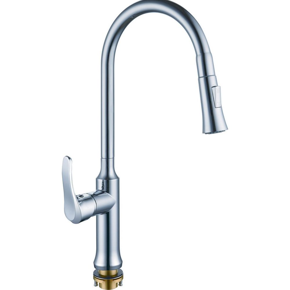 Смеситель для кухни изготовлен из латуни, обладает вытяжной лейкой для удобства использования. Высота излива составляет 27,4 см, а длина — 23,8 см, что дает возможность комфортно управляться с большими емкостями. Керамический картридж и глянцевая поверхность подчеркивают стиль и долговечность конструкции.