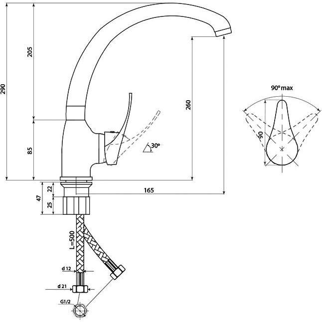 Смеситель изготовлен из латуни с глянцевой поверхностью, которая легко чистится и долго сохраняет эстетичный вид. Высота излива составляет 26 см, а его длина — 16.5 см, что обеспечивает удобство в использовании. Устройство оснащено аэратором, гибкой подводкой и системой быстрого монтажа, упрощающей установку.