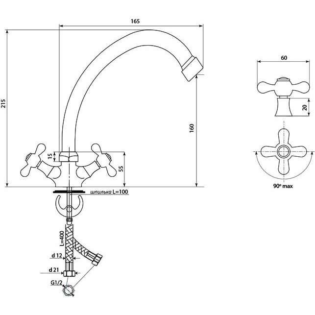 Смеситель оснащен пластиковым аэратором с металлическими сетками и гибкой подводкой из нержавеющей стали длиной 40 см для удобного подключения. Вентильная головка с 20 шлицами и угол поворота в 90 градусов дополняется антишумовой вставкой. Высота излива составляет 16 см, а его длина — 14.6 см, что делает модель универсальной для большинства кухонь. Расположенная кран-букса выполнена из керамики, что обеспечивает плавность и точность регулировки потока воды.