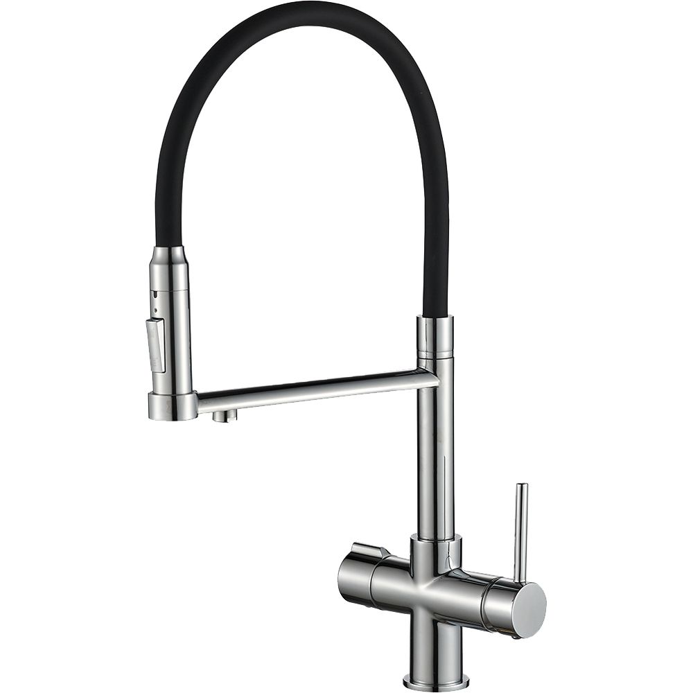 Смеситель выполнен из латуни с глянцевой хромированной поверхностью, которая придает ему элегантный вид. Высота излива составляет 21.6 см, а длина — 21.8 см, что делает его подходящим для большинства стандартных кухонных раковин. Два отдельных канала для водопроводной и питьевой воды предотвращают их смешивание, а гибкая подводка гарантирует простоту установки. Смеситель оснащен керамическим картриджем, обеспечивающим плавность работы и долговечность.