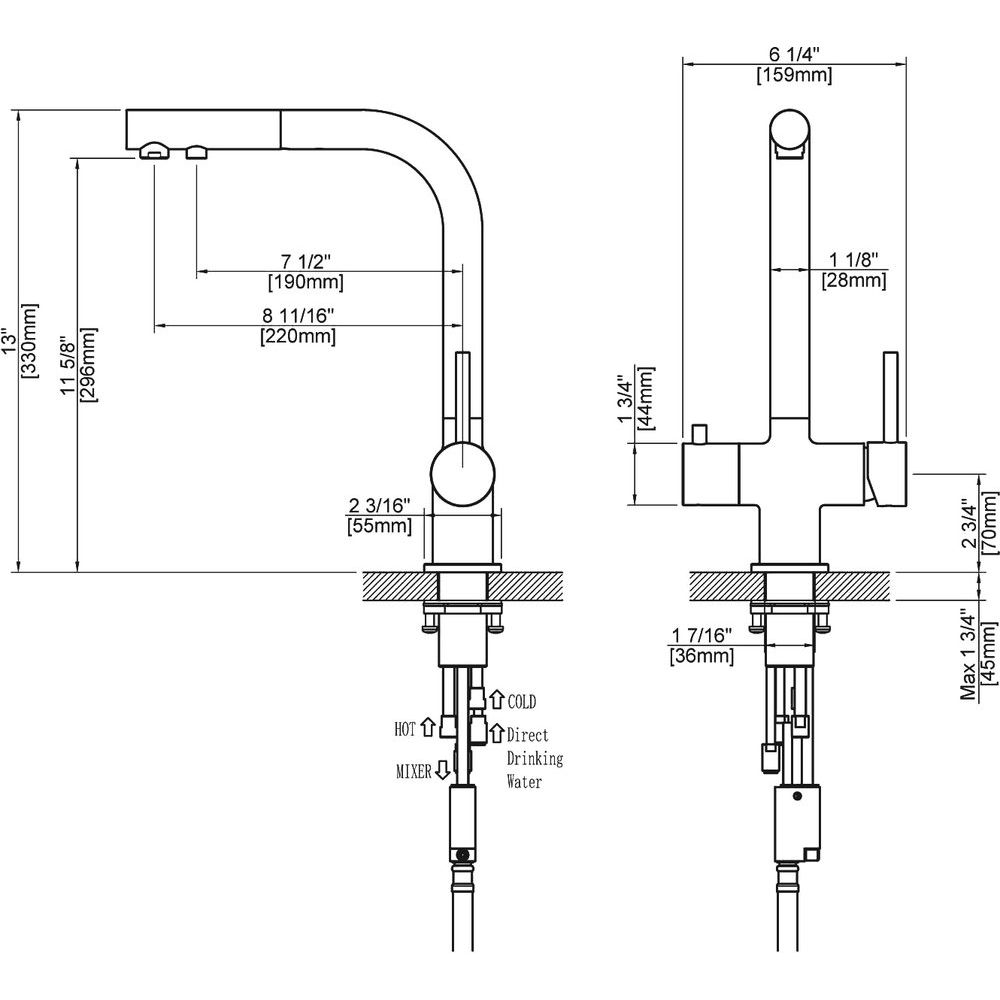 - Удобство использования: выдвижной излив и возможность подачи питьевой воды через дополнительный излив.