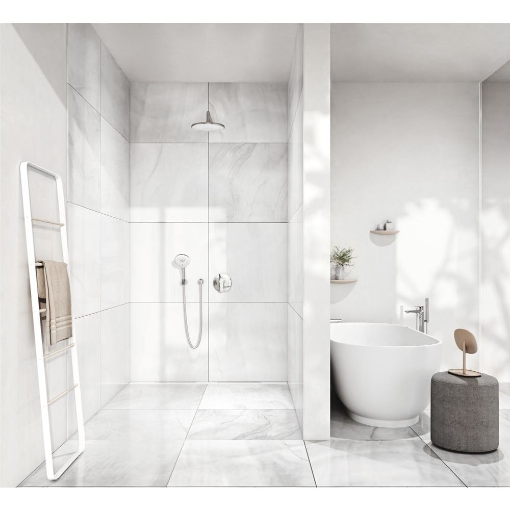 - Комплектация включает душевой гарнитур с фиксированным изливом и переключателем потока.