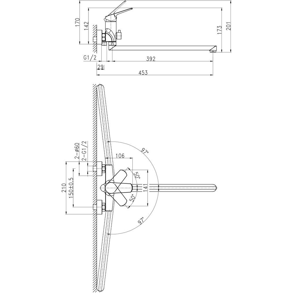 Смеситель имеет длину излива 45 см, что позволяет комфортно использовать его для различных задач. Рычажное управление обеспечивает легкость в обращении. В комплекте предусмотрены аэратор и эксцентрики для удобства установки. Подводка 1/2 гарантирует совместимость с большинством сантехнических систем.