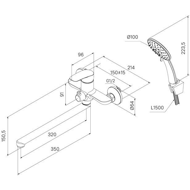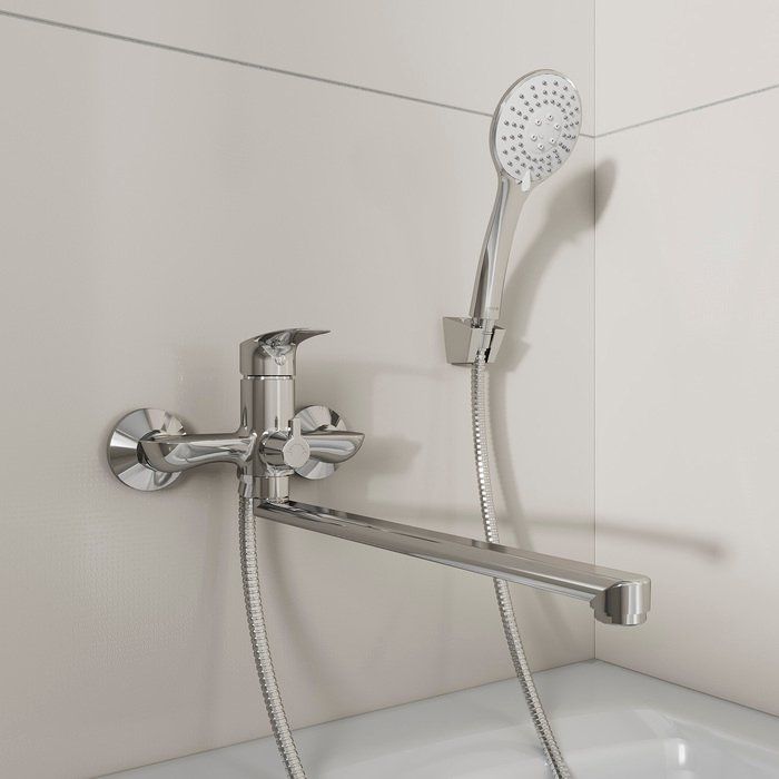 Corпус смесителя выполнен из качественной латуни, отвечающей всем государственным стандартам и санитарным нормам. Смеситель оснащен рычажным управлением и имеет излив длиной 32 см, что обеспечивает удобное использование. Он оборудован надежным керамическим картриджем, гарантирующим плавность работы на протяжении многих лет. Душевая лейка размером 10 см имеет один режим струи, а покрытие из нержавеющей стали защищает шланг от перекручивания. В комплект входят вс необходимые детали для монтажа — эксцентрики и настенный держатель.