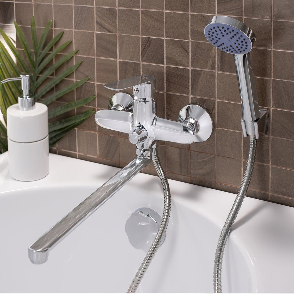 - Благодаря длине излива в 35 см, смеситель универсален для установки в различных типах ванн и умывальников.