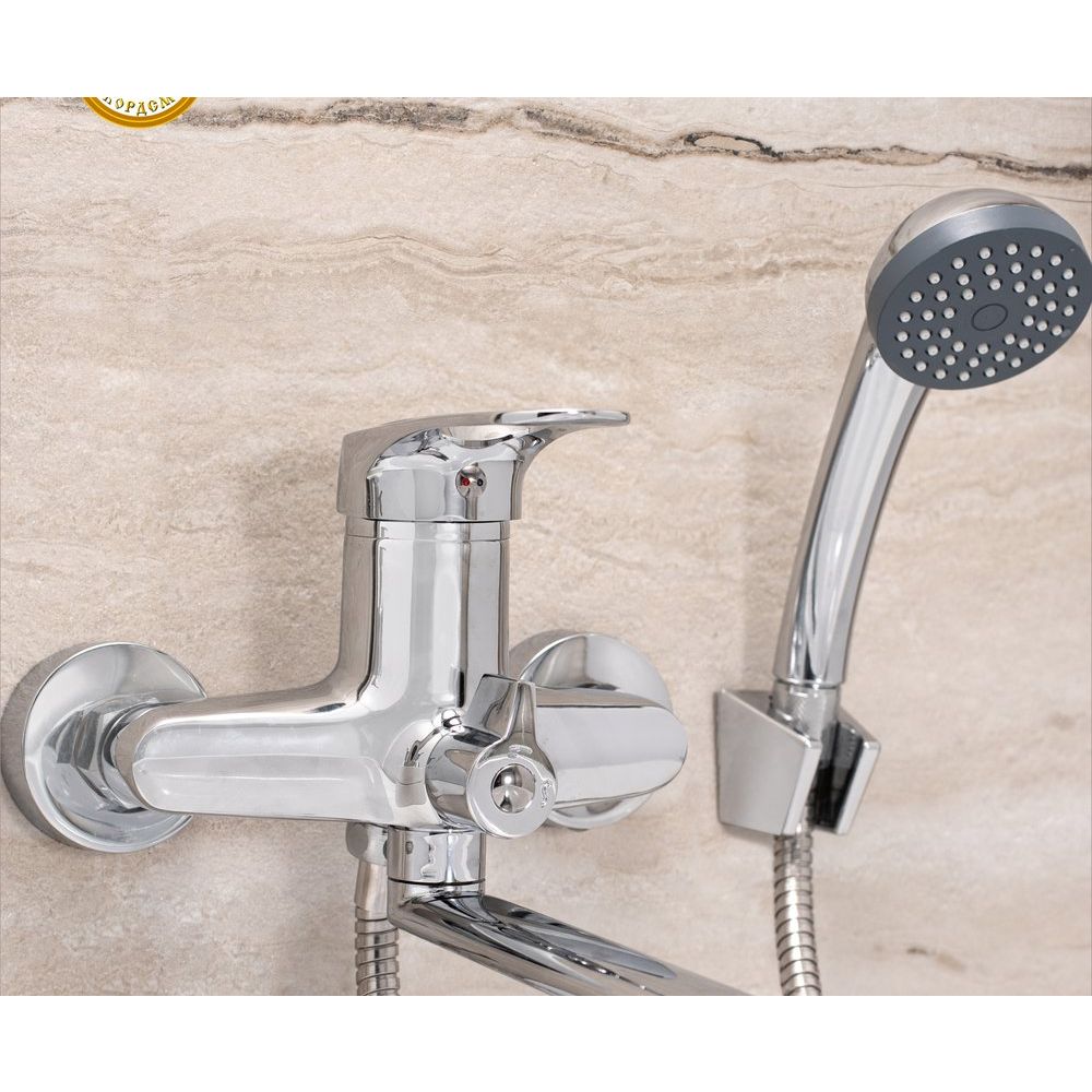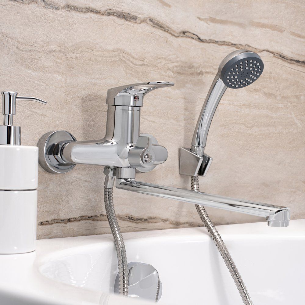 Смеситель выполнен из цинкового сплава и оснащен керамическим картриджем для долговечной работы. С длиной излива 30 см, он прекрасно подойдет для большинства ванных комнат. Встроенный девиатор автоматически переключает поток с душа на излив при закрытии воды. Душевая лейка имеет 1 режим струи и диаметр 8 см, что делает использование максимально комфортным. Глянцевое покрытие и аэратор обеспечивают стильный внешний вид и сниженный расход воды до 25 л/мин. Комплект содержит всё необходимое для установки: душевую лейку, душевой шланг, эксцентрики и настенный держатель. Подводка составляет 1/2 дюйма, что соответствует стандартам и облегчает монтаж.