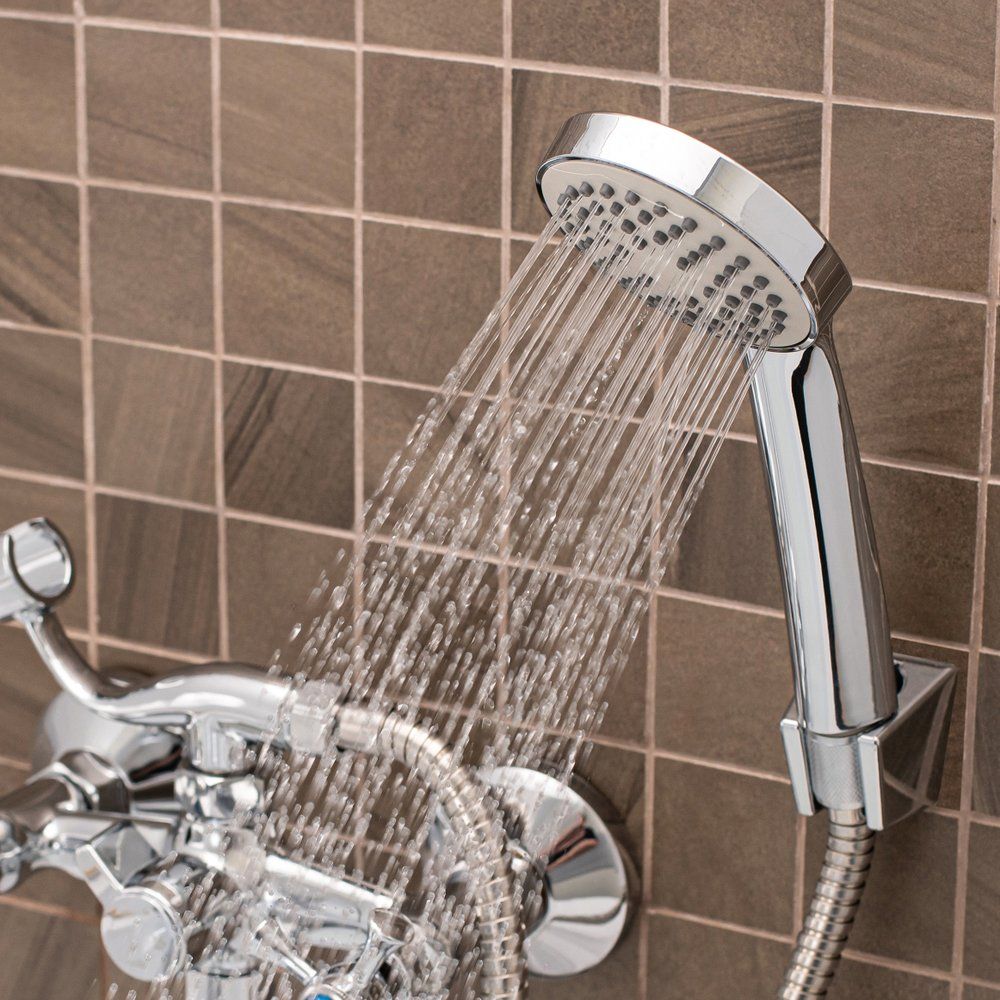 - Душевой гарнитур включает в себя лейку с одним режимом струи и диаметром 8,5 см, а также шланг и настенный держатель.