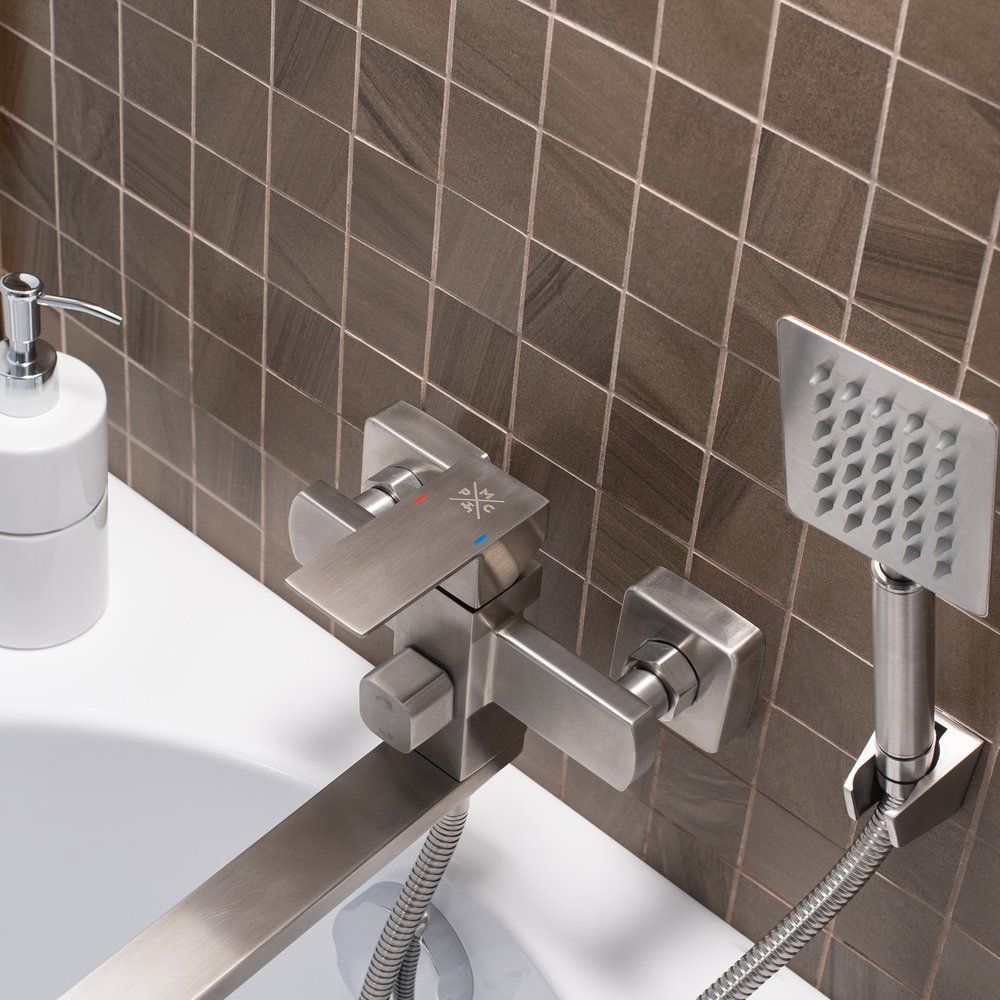 - Полный комплект — душевой гарнитур, включая лейку, шланг, эксцентрики и настенный держатель, идет в комплекте.