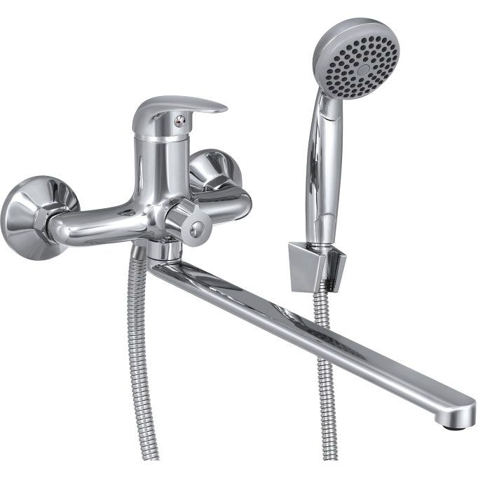 Универсальный смеситель оборудован пластиковым аэратором с монетарным креплением и рычажным управлением. Латунный корпус обеспечивает надежность конструкции, глянцевая поверхность придаёт изделию эстетичный вид. Излив длиной 37,5 см подходит для различных нужд. Смеситель оснащён керамическим картриджем и комплектуется душевой лейкой размером 6,5 см с одним режимом струи, шлангом, эксцентриками и настенным держателем. Гарантия на корпус составляет 8 лет, а на комплектующие — 2 года.