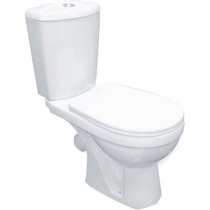 Унитаз-компакт имеет косой выпуск (под углом), что подходит для большинства современных систем канализации. Фарфоровый материал обеспечивает долговечность и эстетичный вид. Форма воронки и подвод воды снизу оптимизированы для удобства и эффективности. Объем смыва регулируется на 3 или 6 литров, что позволяет контролировать расход воды. Унитаз поставляется с полипропиленовым сиденьем в комплекте.