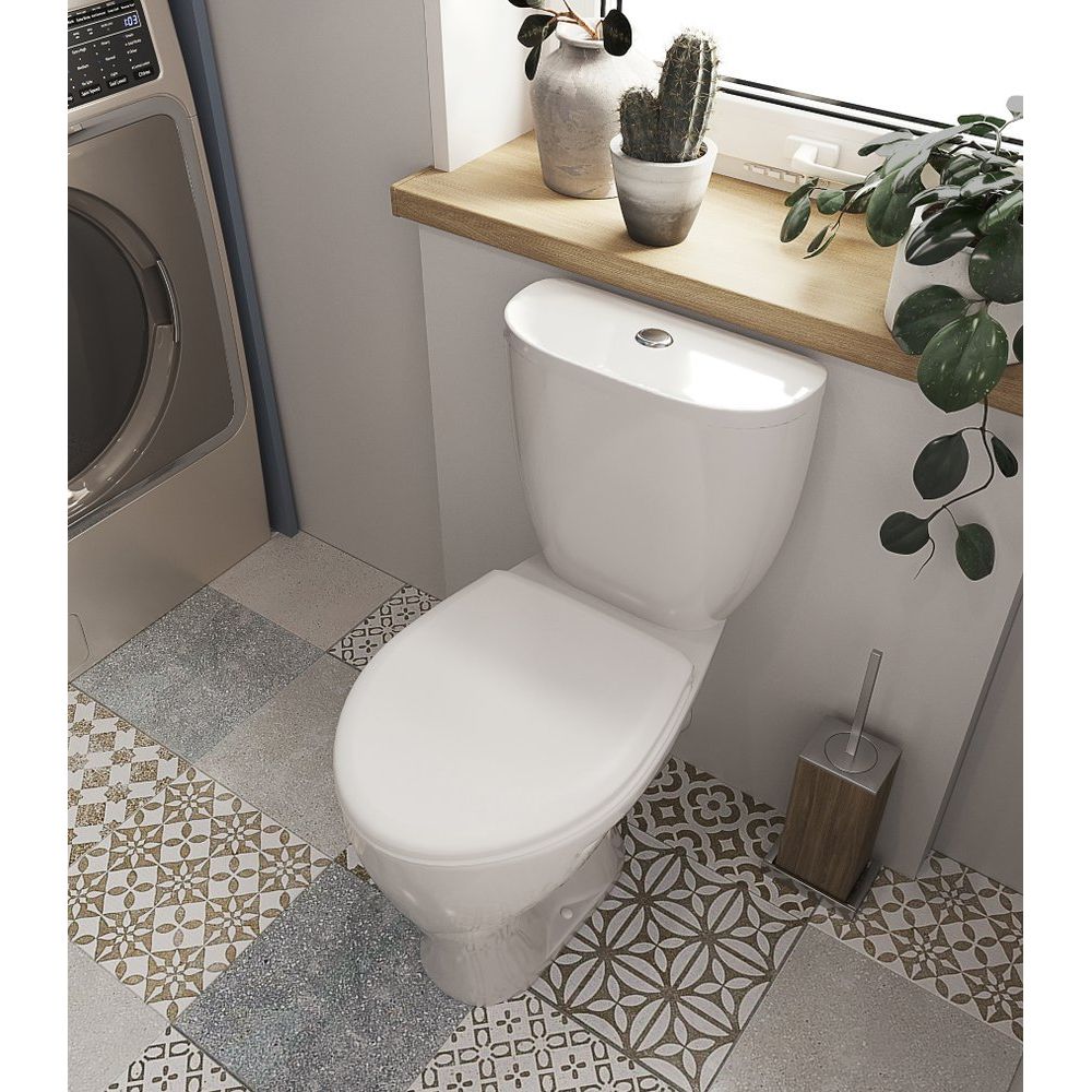 Этот унитаз с косым выпуском под углом идеально впишется в любую ванную комнату благодаря классическому белому цвету. В основе конструкции — прочный и долговечный фарфор. В комплекте идет сиденье из полипропилена, а практичная полочка в чаше придаёт дополнительный комфорт в использовании. Экономичный слив с двойной кнопкой позволяет выбрать между 3 и 6 литрами воды. Установка облегчена благодаря нижнему подводке воды, что позволяет аккуратно скрыть коммуникации.