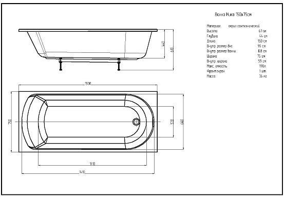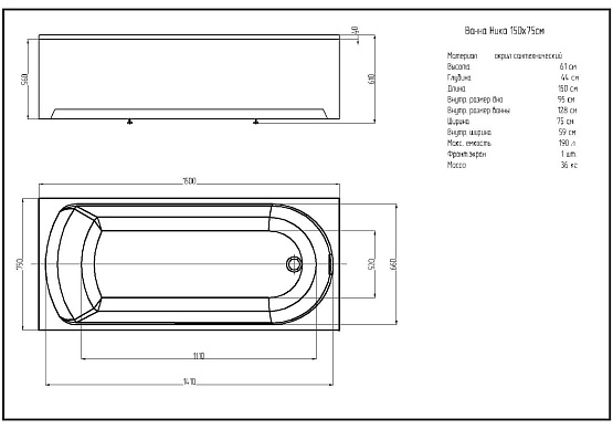 Габариты ванны составляют 150х75 см, высота с опорой — 61 см, а глубина — 44 см, что обеспечивает максимальный комфорт при купании. Максимальная емкость ванны — 195 литров. Монтаж осуществляется пристенно, а стандартное расположение слива удобно для подключения к водопроводной системе. Диаметр слива — 5,2 см. Ванна поставляется без фронтального и бокового экранов, без каркаса и без системы слив-перелив, которые приобретаются отдельно. Опоры могут быть металлическими сборно-разборными (шпильки) или в виде ножек.