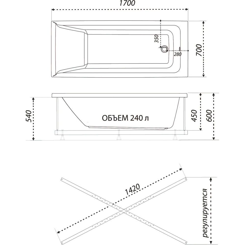 Акриловая ванна 1ACReal Тори имеет габариты 170x70 см и объем 240 литров, что позволяет наслаждаться расслабляющими водными процедурами. Особое антискользящее покрытие заботится о вашей безопасности. Ванна требует приобретения слив-перелива отдельно, с диаметром слива 5.1 см. В комплект входит универсальный металлический каркас Triton с пятью опорами, а также экран Територи 170, обладающий габаритами 169,5x69,5 см. Продуманная конструкция обеспечивает легкую установку и надежность.