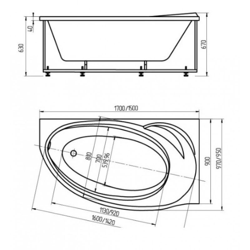 - Внутренний размер ванны: 1600 мм