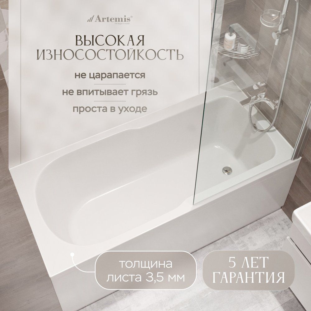 Акриловая ванна Artemis Flora имеет размеры 150х70 см и вмещает до 175 литров воды, обеспечивая вам полноценное расслабление. В конструкции используется качественный износостойкий акрил, который не только долговечен, но и прост в уходе. Особое внимание уделяется удобству монтажа — ванна встраиваемая и укомплектована прочным каркасом. Диаметр сливного отверстия составляет 5.2 см. Подголовник и слив-перелив приобретаются отдельно.