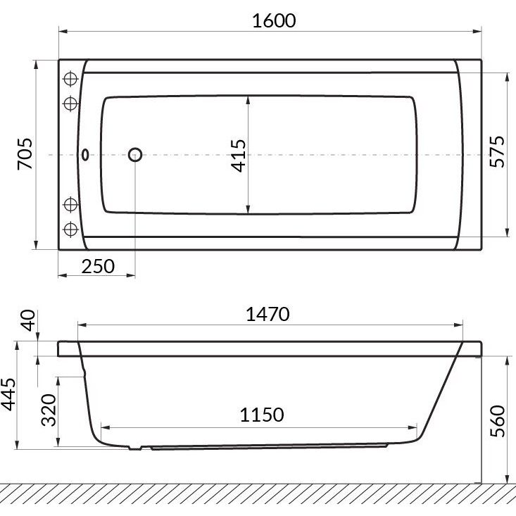 Размеры (Д x Ш): 160x70,5 см. Объем ванны 210 литров.